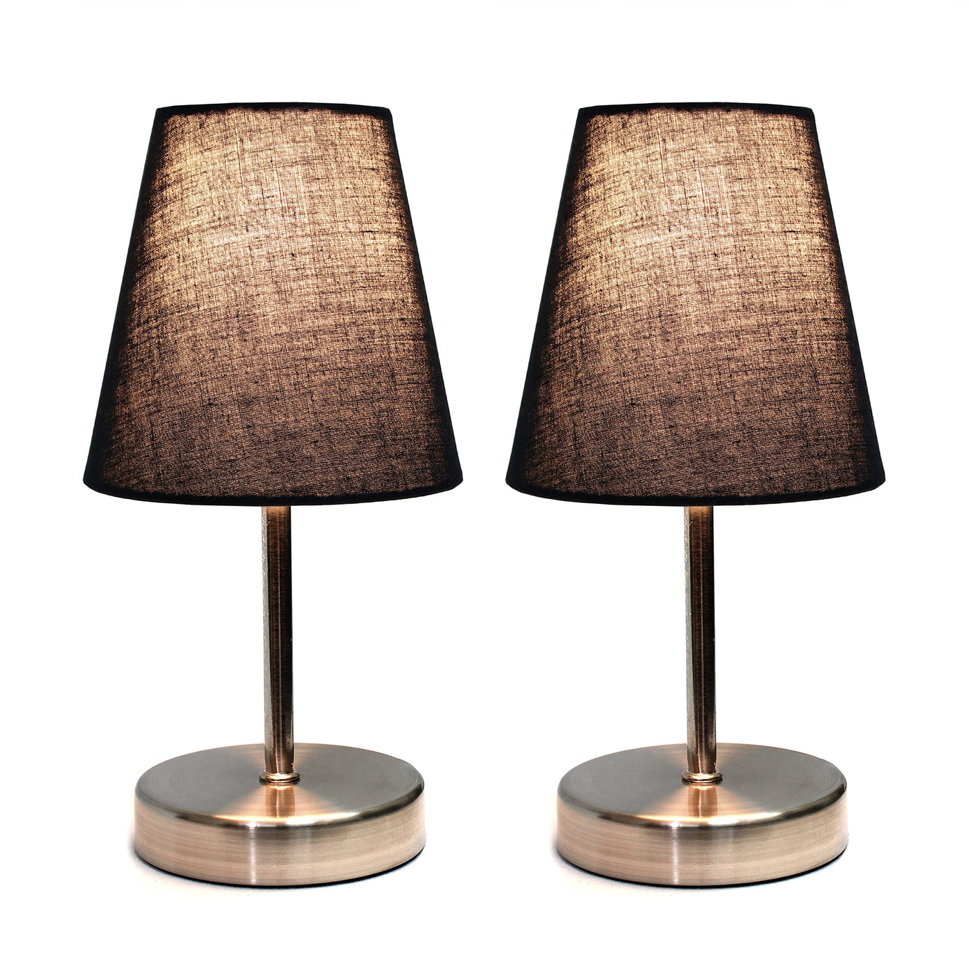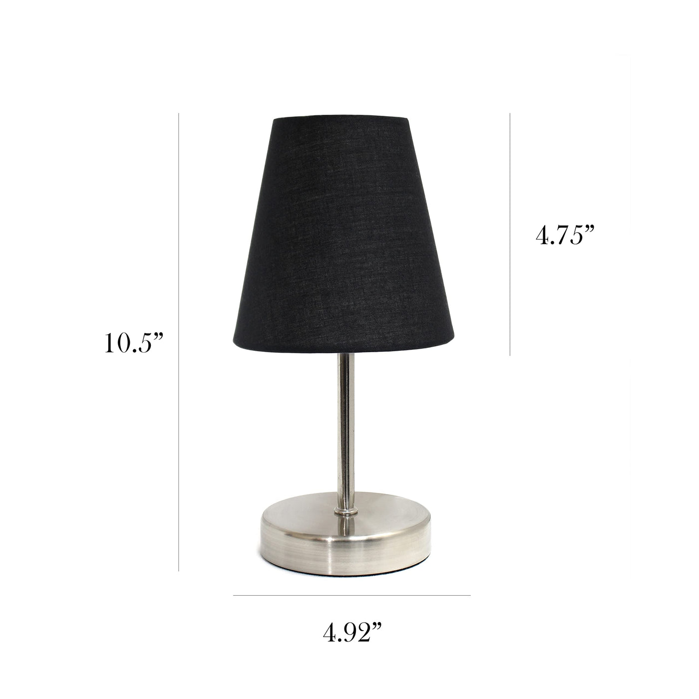 Charming inexpensive and practical mini table lamp set to meet your basic fashion lighting needs. These mini lamps feature a sand nickel metal base and fabric shades. Perfect for living room bedroom office kids room or college dorm!. 2 x Sand nickel metal mini bases. 2 x fabric shades. Perfect for living room, bedroom, office, kids room or college dorm. Each uses 1 x 40W Type B Candelabra Base Bulbs (not included). Height: 10" Shade diameter: 4.88"