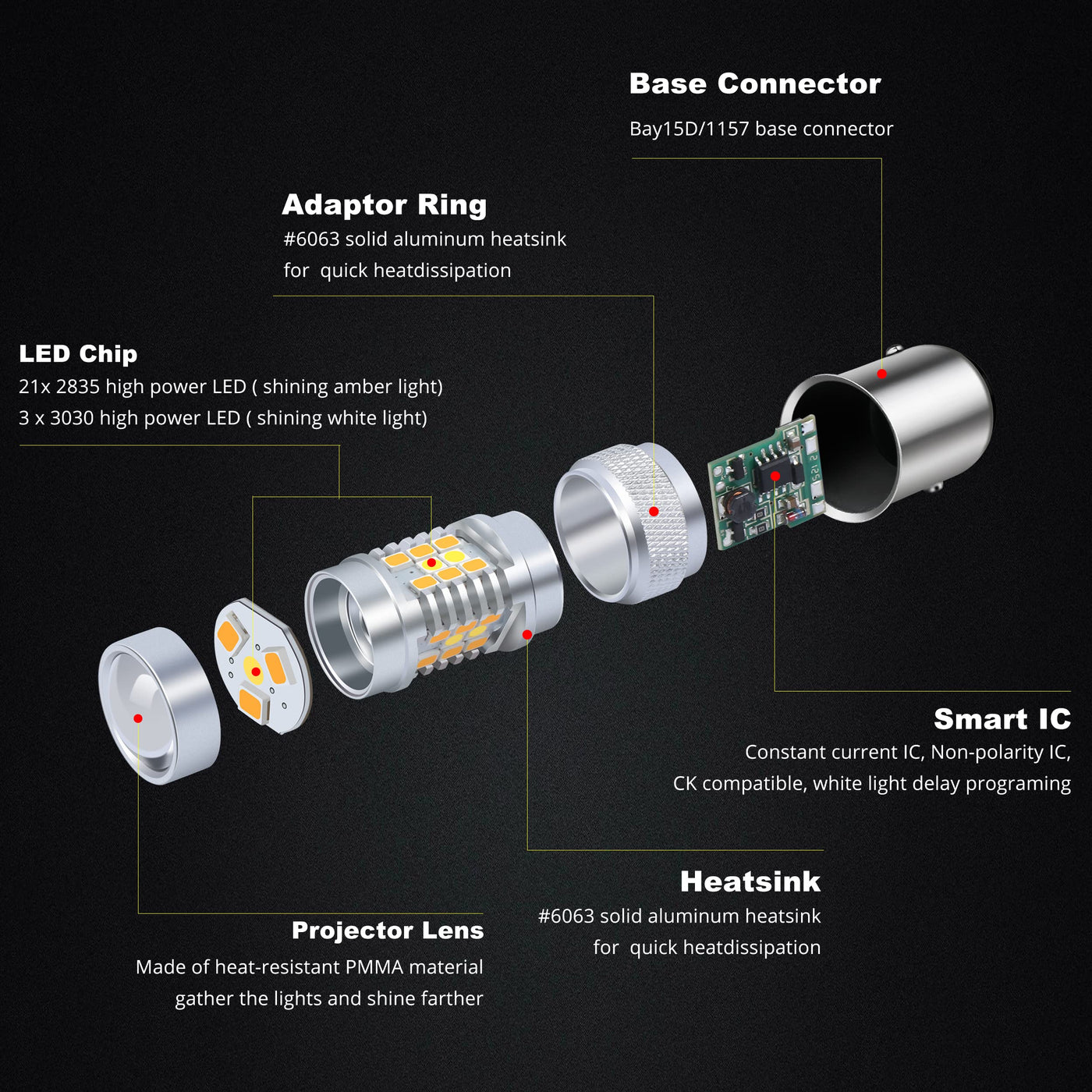 Alla Lighting BAY15D 1157 Switchback LED Turn Signal Lights, Dual Color Amber Yellow/6000K White 12V 3496 7528 2357NAK 2357AK Extremely Super Bright 2835 28-SMD Upgrade This listing features one pair (2 pieces) super extremely bright 1157/2357A/7528 LED switchback dual color amber white high power 2835 28-SMD led bulbs especially designed for replacing the original bulb has dual function: front turn signal & parking or DRL (daytime running light) on the same bulb Specification 1) Package: including 2 pieces extremely bright 1157 Led switchback bulbs. 2) LED Chips: 28 pieces high power 2835 SMD per led bulb. 3) Cross Reference: 1016, 1034, 1157, 1157A, 2057, 2357, 2357A, 2397, 3496, 7528, 1034A, 1034NA, 1035, 1157NA, 198, 198NA, 2057NA, 2357NA, 7528L, 7225, 94, 1076 and 1154. etc 3) Application: Light up white for parking lights or daytime running lights. Light up amber-off-amber-off for turn signal lights instead of amber all the time to make more noticeable Working Voltage 12V DC5) Warranty: One Year guaranteed on manufacturer quality 6) Please note: Due to led bulbs draw much less current than stock lamp, your car may require load resistor to avoid hyper flash or malfunction.
