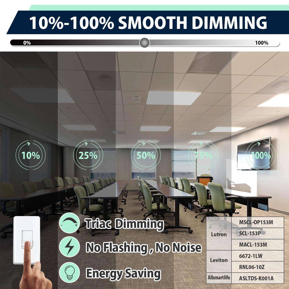 Q: What are the benefits of using the Allsmartlife 2x2 LED Flat Panel Light over traditional lighting?A: The Allsmartlife 2x2 LED Flat Panel Light consumes only 40W, replacing four 140W incandescent bulbs, resulting in significant energy savings. It also offers a long lifespan of up to 50,000 hours, reducing the need for frequent replacements. Additionally, its smooth dimming feature allows for customizable brightness without flickering or noise, making it ideal for various environments.