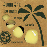 Q: Are Aloha Bay Tea Lights scented?A: No, Aloha Bay Palm Wax Tea Lights are unscented, providing a clean burning experience without any added fragrances.