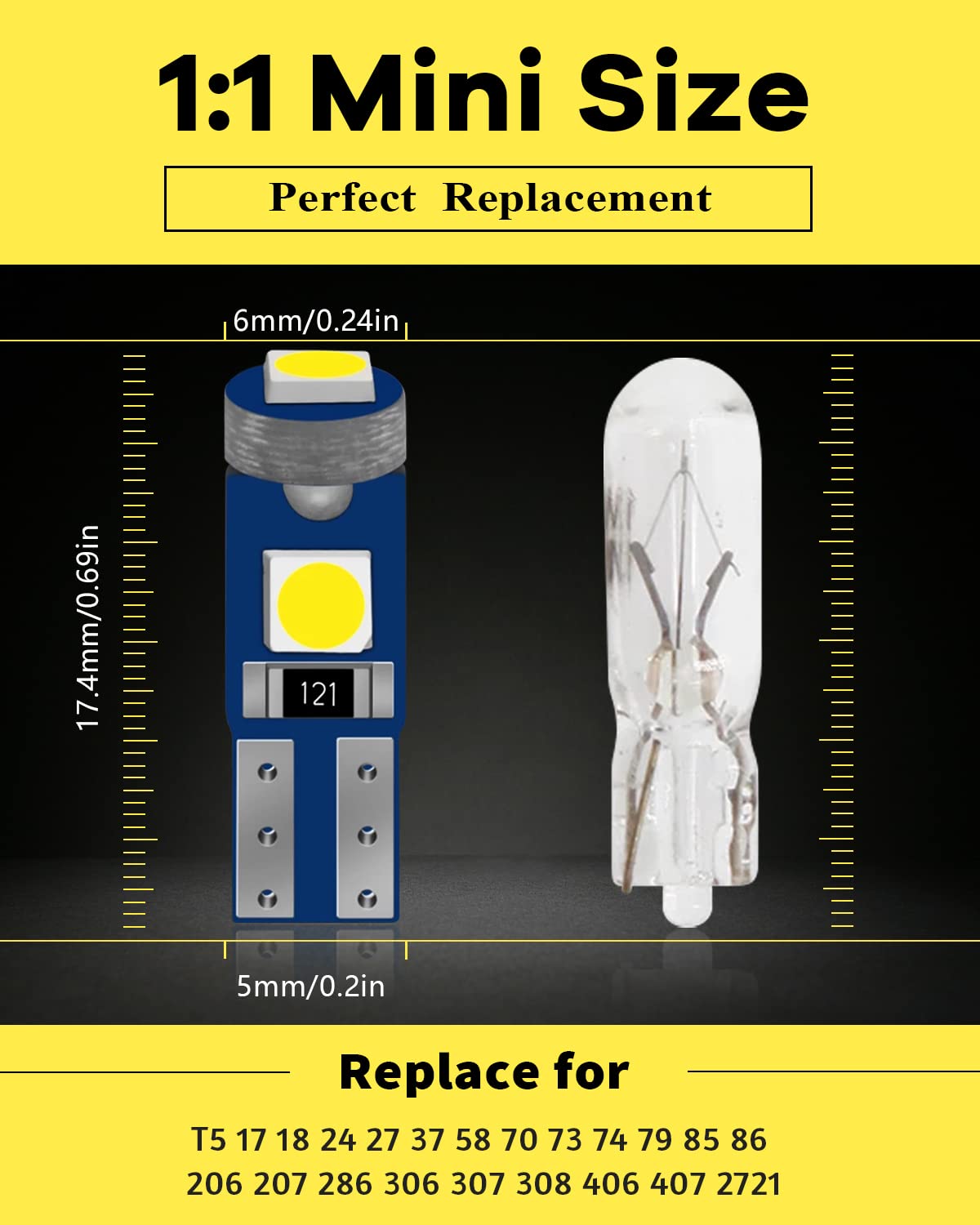???Fitment?: Standard T5 74 base, can be used as replacement for 37 882 17 18 27 58 70 73 79 85 86 206 207 286 306 307 308 406 407 2721 etc. Plug and play, easy to install. If they don't work just flip them around and they will work perfectly. | ???Wide Applications?: Impressive replacements for incondescent bulbs. Can be used for automotive motorcycle interior instrument panel lights, ash tray lights, indicator light, gear shifter light,vanity mirror light, glove box light, door light. | ???Selling Points?: The LED bulbs are much brighter and the price is affordable. Unique SMD sequence enhances luminous efficiency; High power 3030 chips creates ultra bright & energy saving luminous. The small size is convenient for storage and easier to be embedded in the lampshade. | ??Key Specs?: The supporting volts is 12V DC, power: 0.6W, lumens: 20 lumens, Length: 0.69" 17.4mm; Color: White; LED Types: 3pcs 3030 Chipset; Lifespan: 10,000 Hours | ???Warm Tips?: One year guarantee and 7x24 hours service can eliminate all your concerns while shopping. Any problems about our products, please let us know, we will always be here to help you solve it.