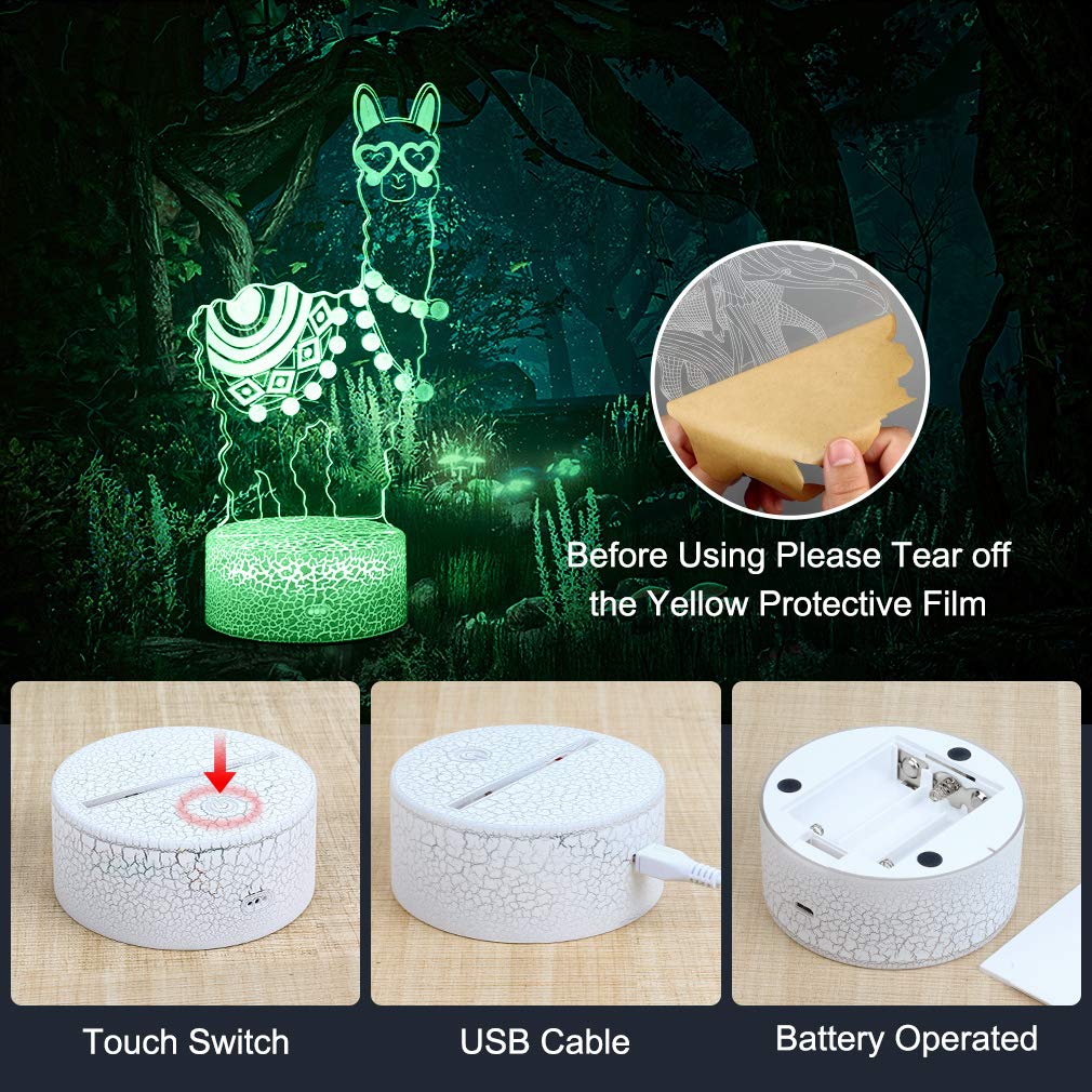 Q: Is the Alpaca Llama lamp suitable for children's bedrooms?A: Yes, the Alpaca Llama 3D Optical Illusion Lamp is designed with kids in mind, making it a great night light for children's bedrooms. Its soft glow and 3D visual effect provide a comforting atmosphere, ensuring a restful sleep.
