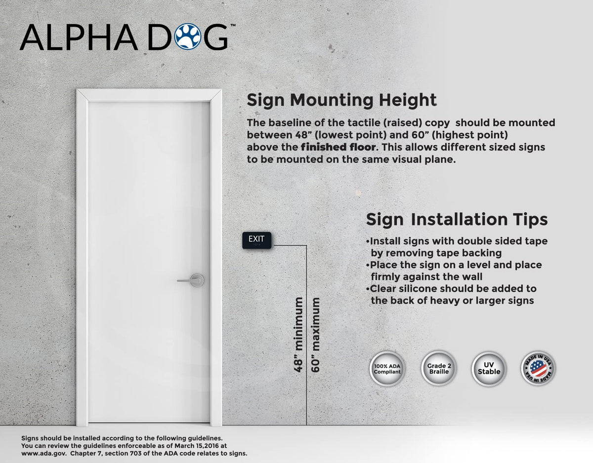 Enhance The Accessibility Of Your Office Or Business With Our Braille Exit Signs. Manufactured By Alpha Dog, These Exit Signs With Braille Signs Are Meticulously Designed To Be 100% Ada Compliant, Meeting Both Federal And California Ada Sign Requirements. Each Ada Exit Sign With Braille Features Grade 2 'Contracted' Braille And 1/32'' Raised Tactile Text, Ensuring Clear And Easy Readability For Visually Impaired Individuals. Not Only Are These Black Exit Signs Functional, They Are Also Durable And Versatile. All Our Exit Signs Are Uv Stable, Making Them Suitable For Both Indoor And Outdoor Locations. Each Black Exit Sign Comes With Foam Mounting Tape For Easy Installation. Our Exit Sign Braille Are Proudly Manufactured In The Usa By Alpha Dog Ada Signs, Ensuring The Highest Quality And Reliability. Invest In Our Signs And Make Your Business More Accessible And Inclusive Today.