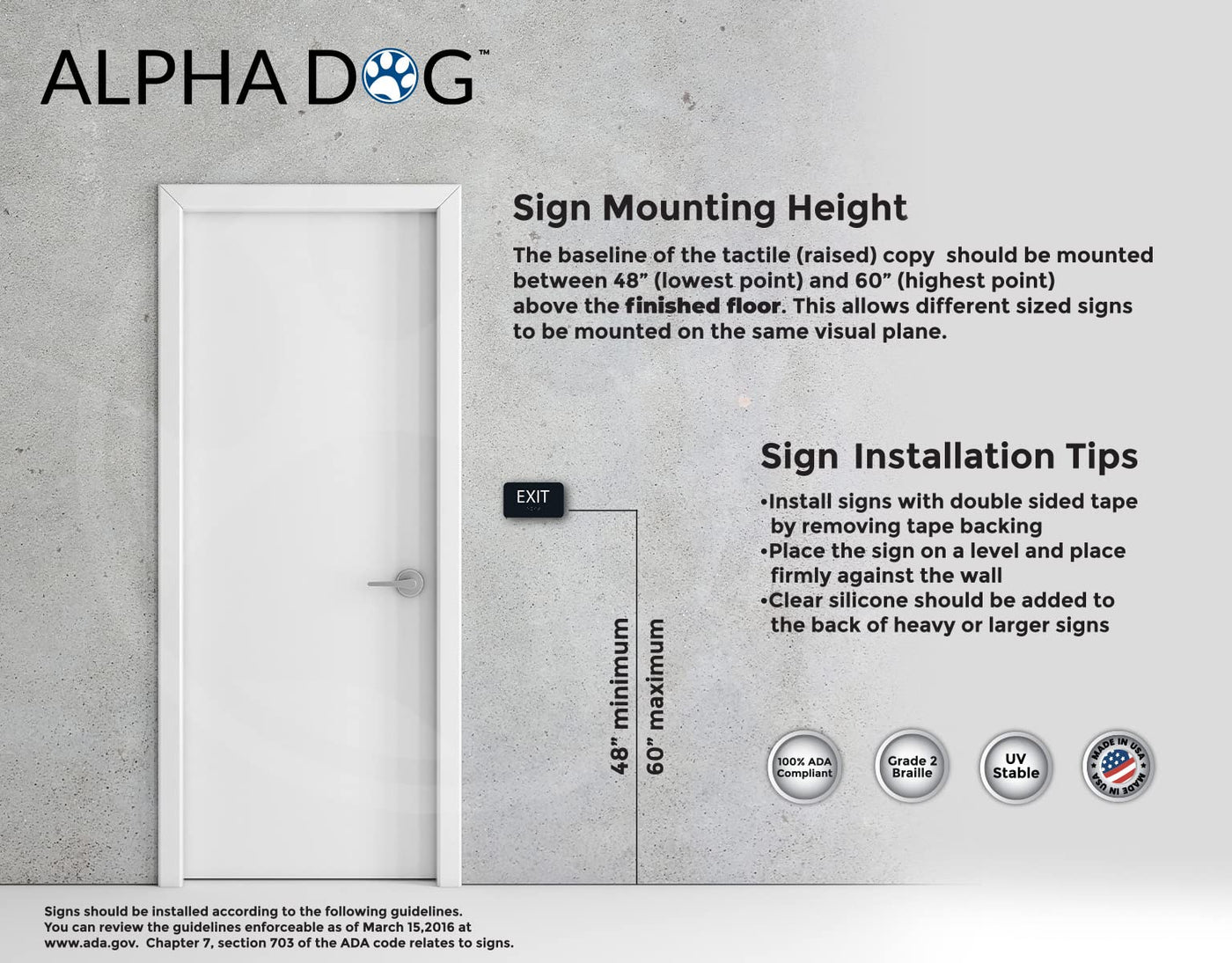 Q: Can this sign be used outdoors?A: Yes, the ALPHA DOG ADA Braille Exit Sign is UV stable and durable, making it suitable for both indoor and outdoor locations.