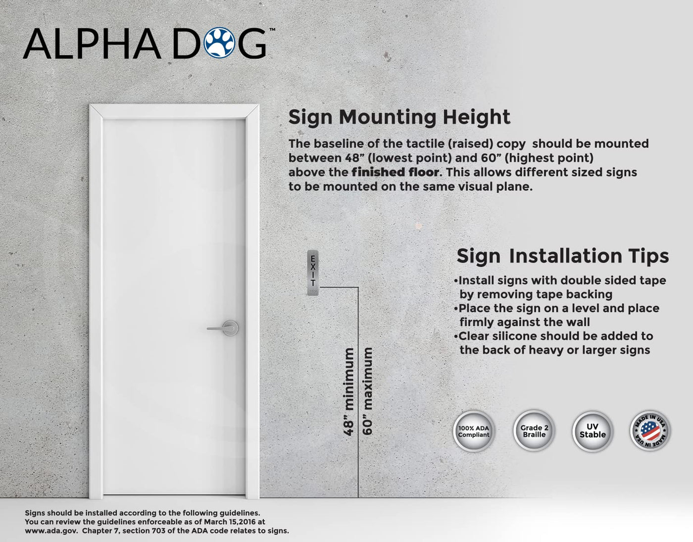 Q: Is the ALPHA DOG exit sign ADA compliant?A: Yes, it is one hundred percent ADA compliant. This ensures that it meets federal and California ADA sign requirements.