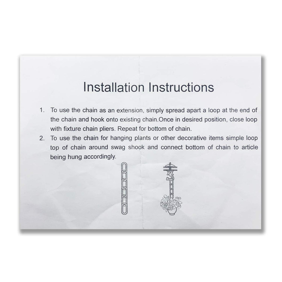 Q: What types of light fixtures can this chain be used with?A: This heavy-duty chain is suitable for a variety of light fixtures, including chandeliers, ceiling lights, and hanging fruit baskets or flower pots, making it versatile for different home decor styles.