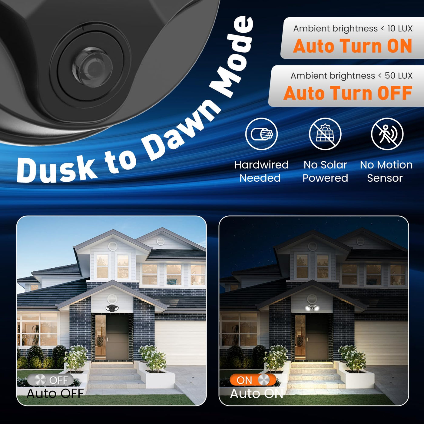 Q: How does the Dusk to Dawn feature work on these security lights?A: The Dusk to Dawn feature utilizes a built-in photocell sensor that automatically turns the lights on at night when the ambient light level drops below 10 Lux, and turns them off during the day when the level exceeds 50 Lux. This ensures hassle-free automatic operation.