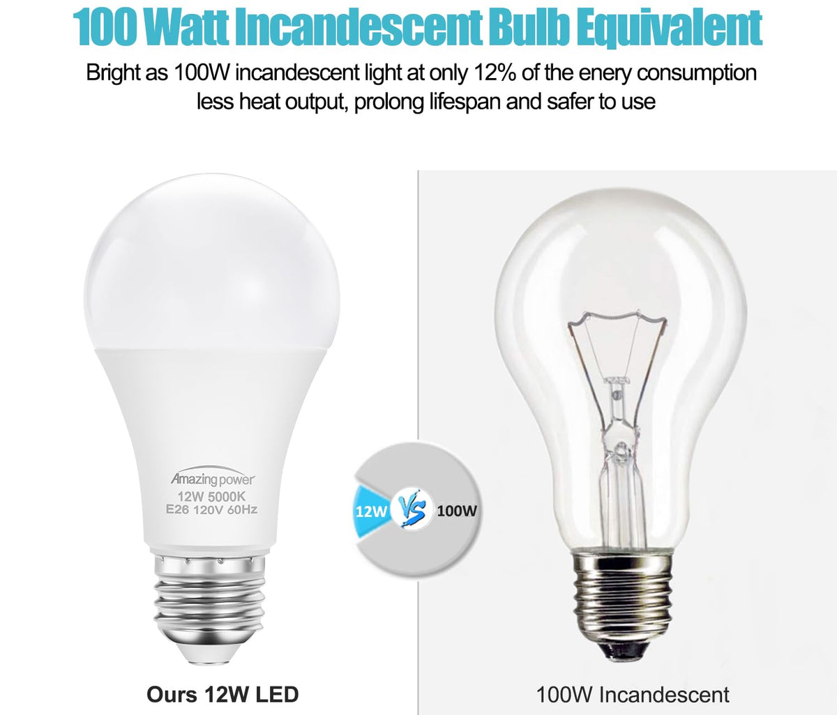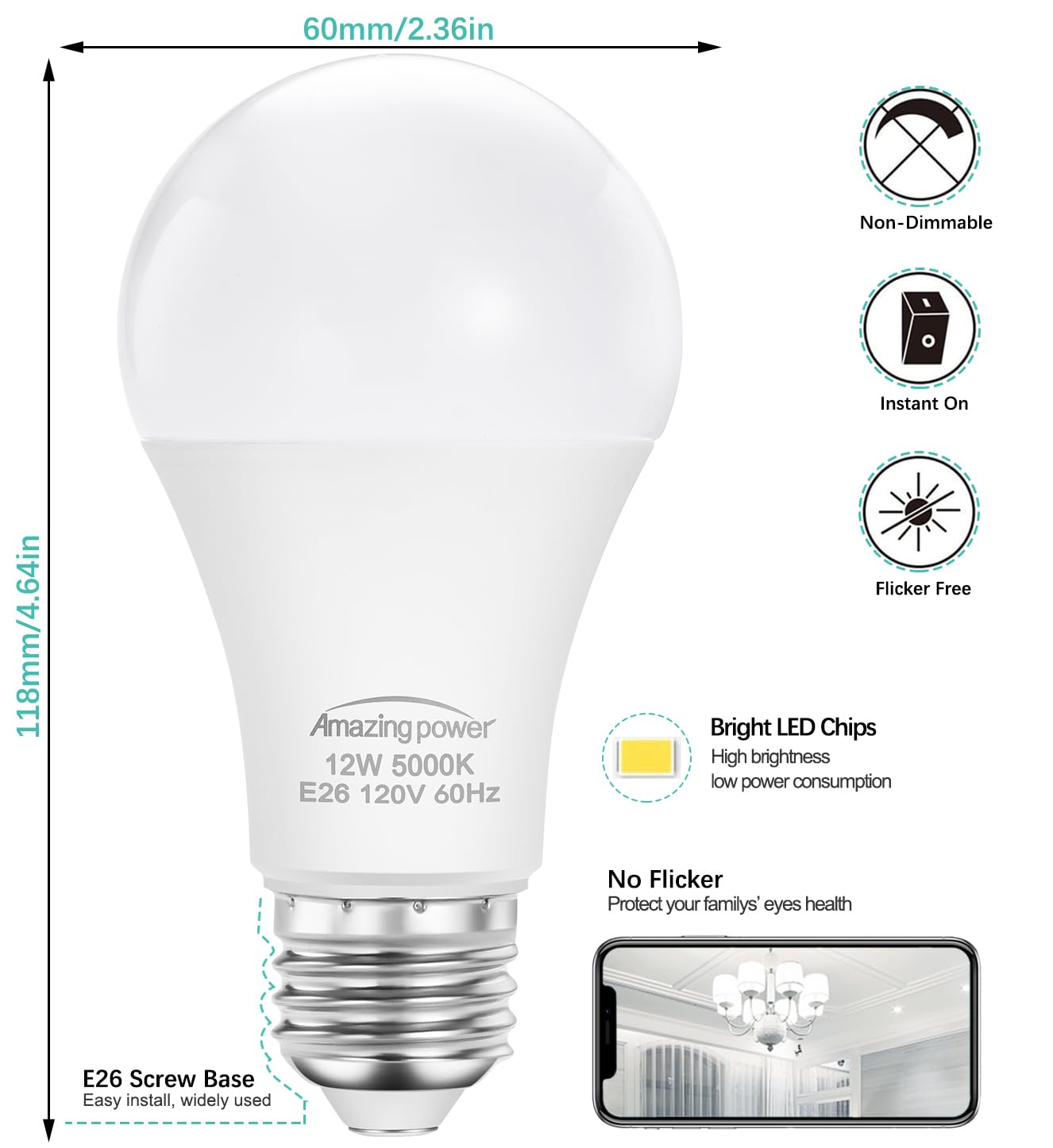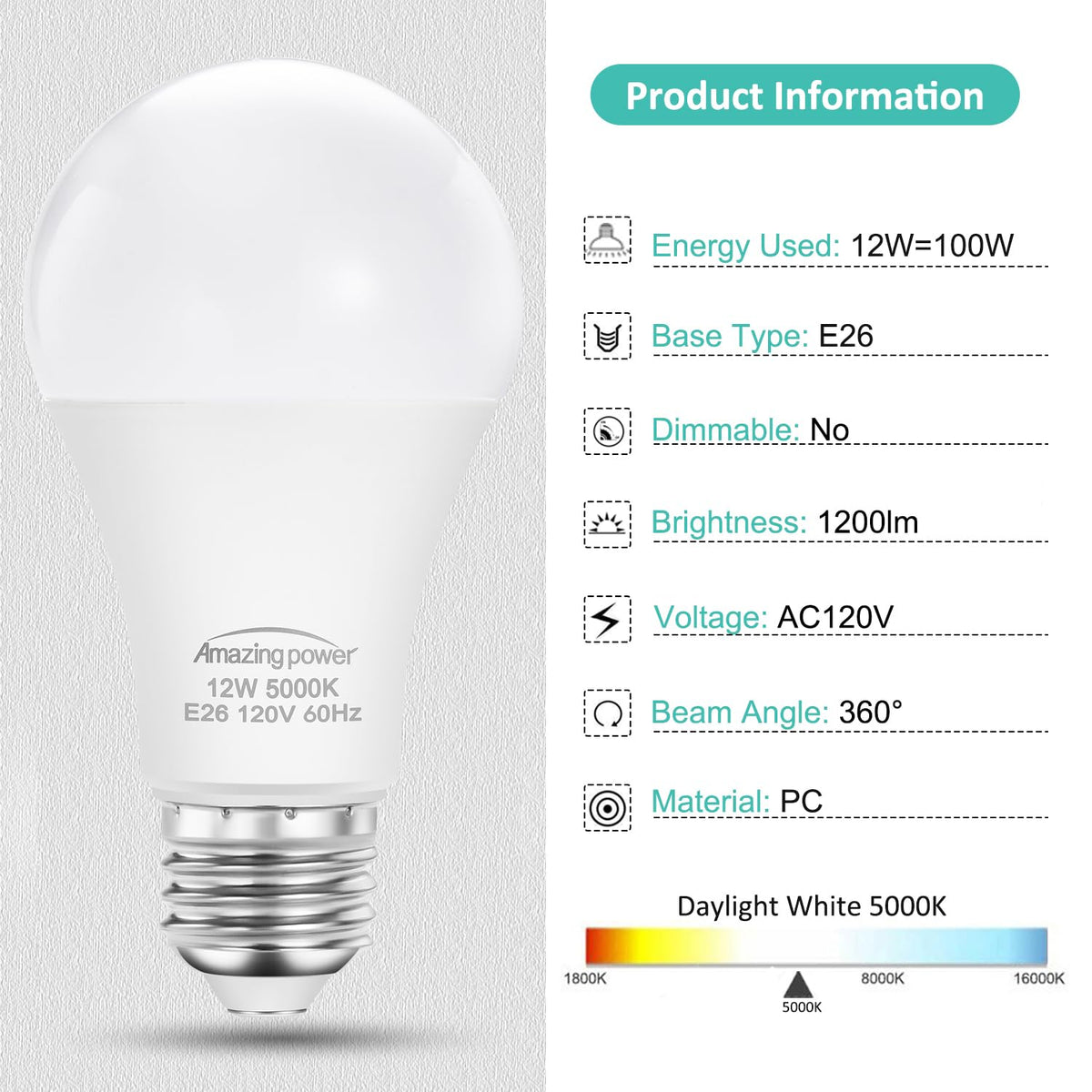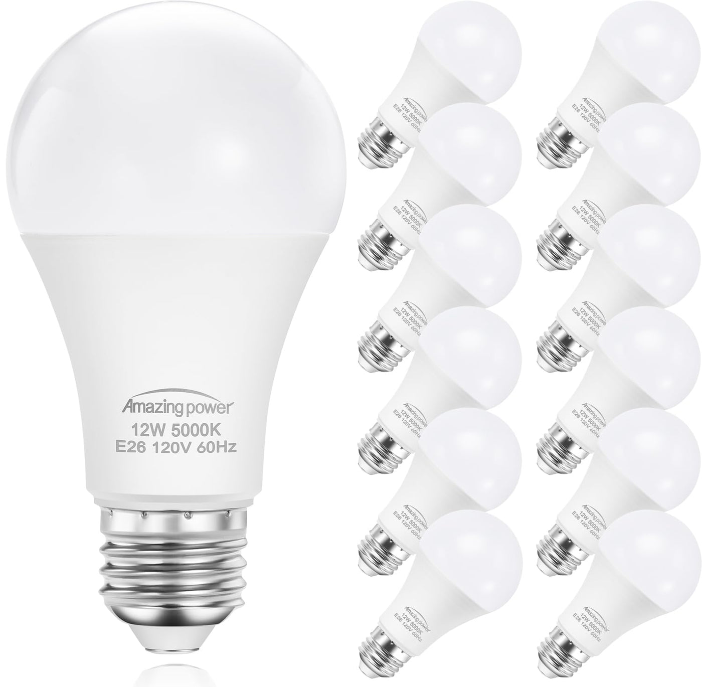Amazing Power 100W Equivalent Light Bulbs, A19 E26 Led Bulbs, 12W 5000K Daylight White 1200 Lumens, Non-Dimmable, 12-Pack
