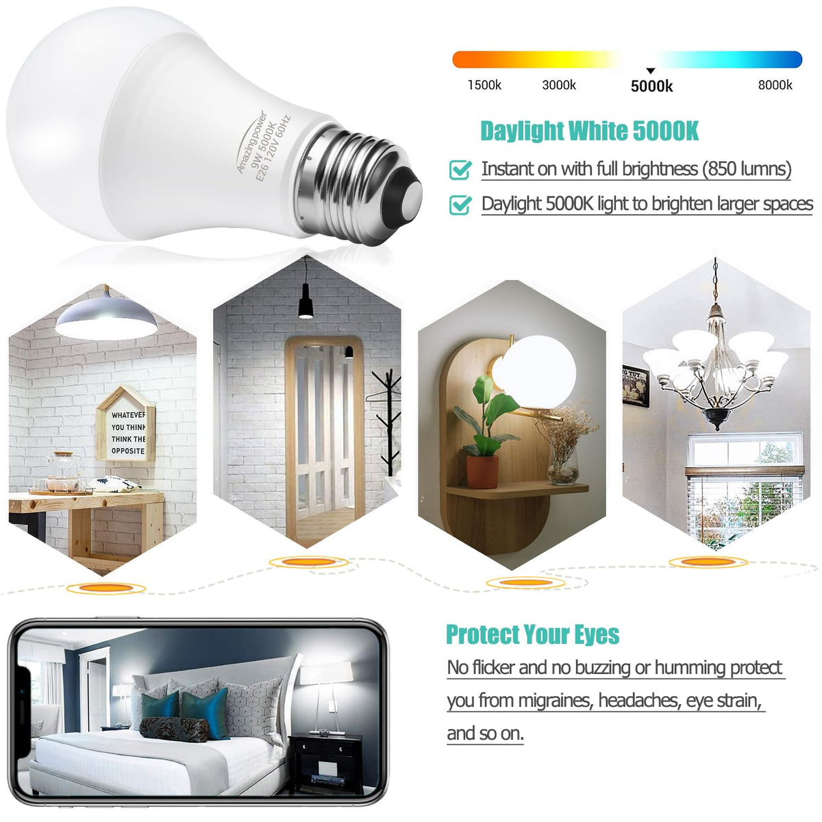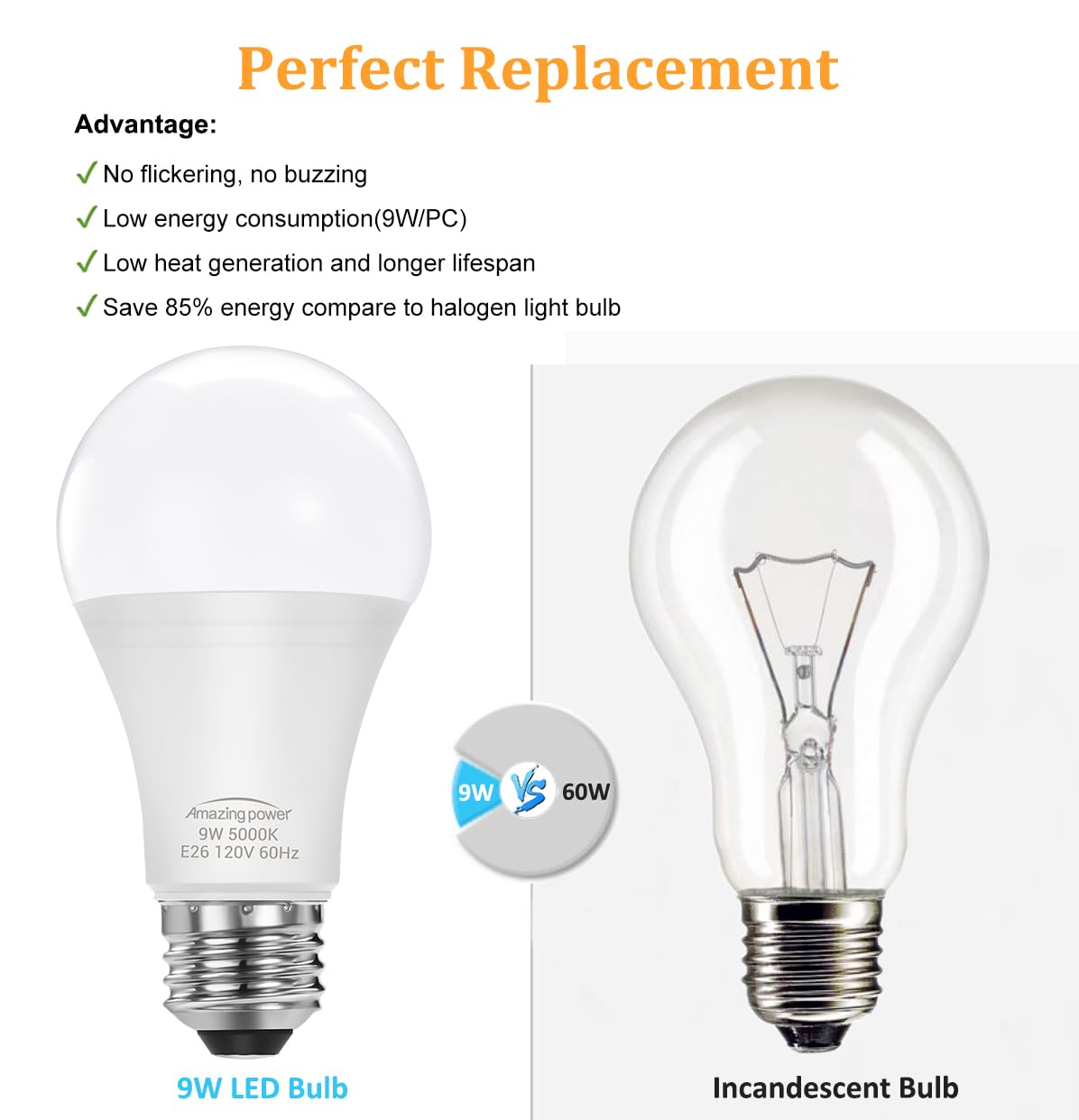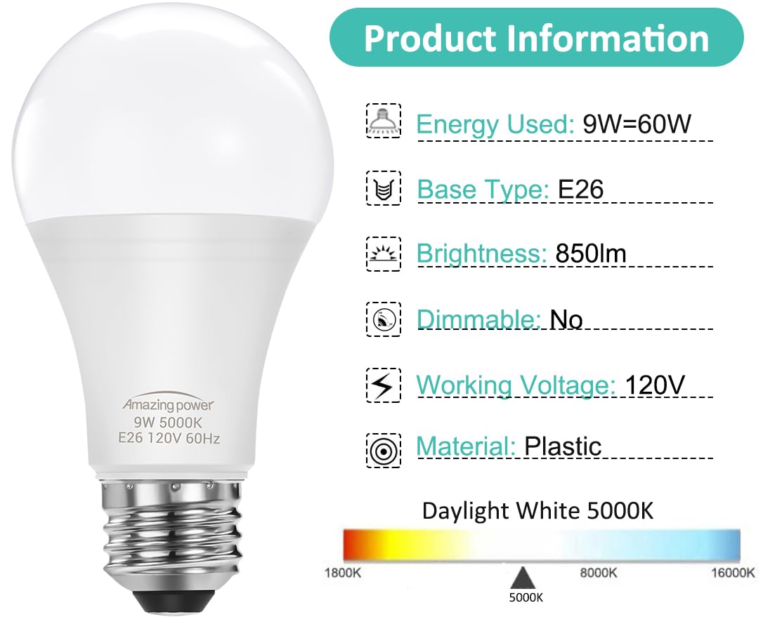 Amazing Power E26 Led Bulbs, 60W Equivalent Medium Base Light Bulbs, 9W Led Bulbs, Daylight White 5000K 4-Pack