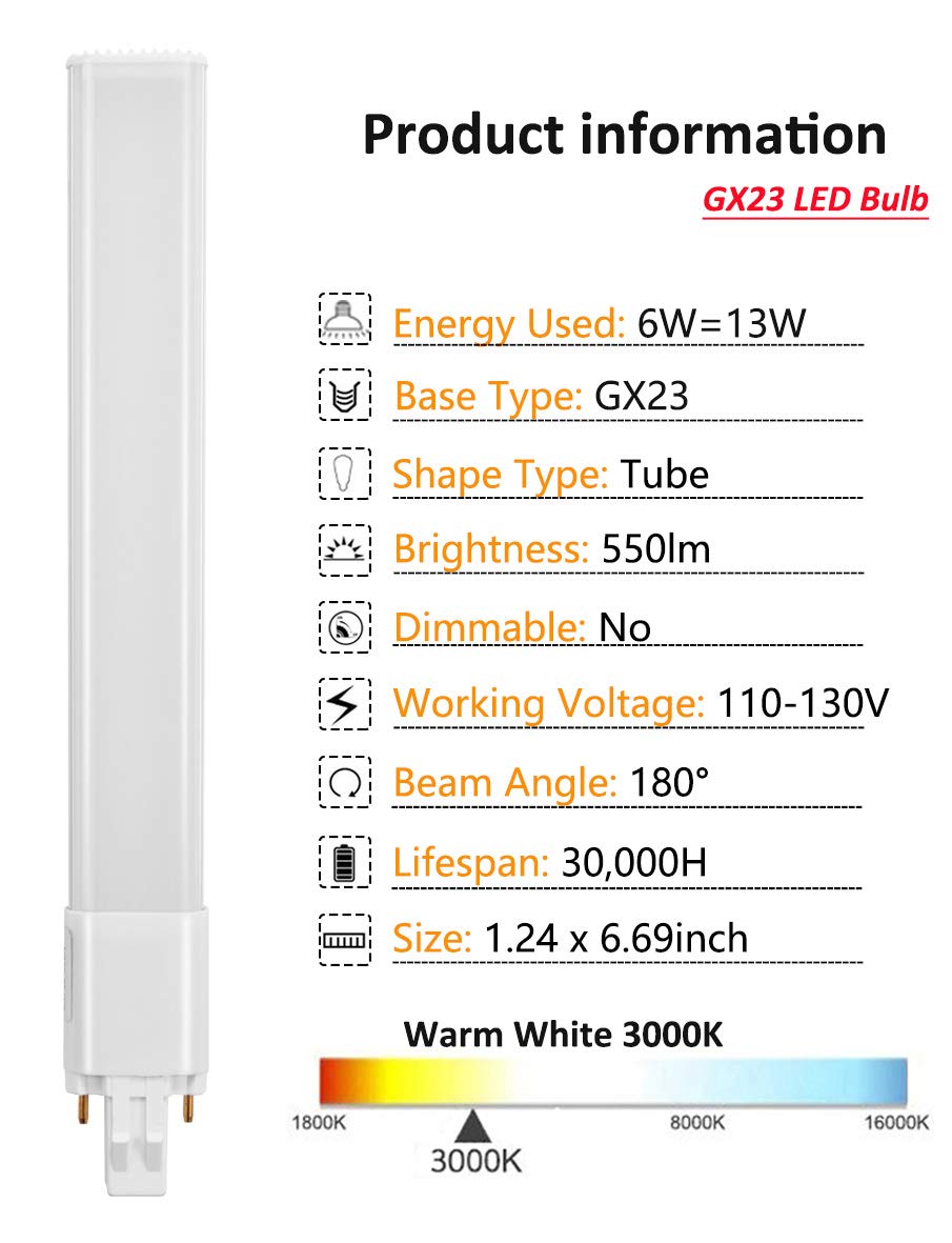 Amazing Power Gx23 Led Bulbs, 6W 2-Pin Warm White 3000K, 13W Cfl Equivalent,