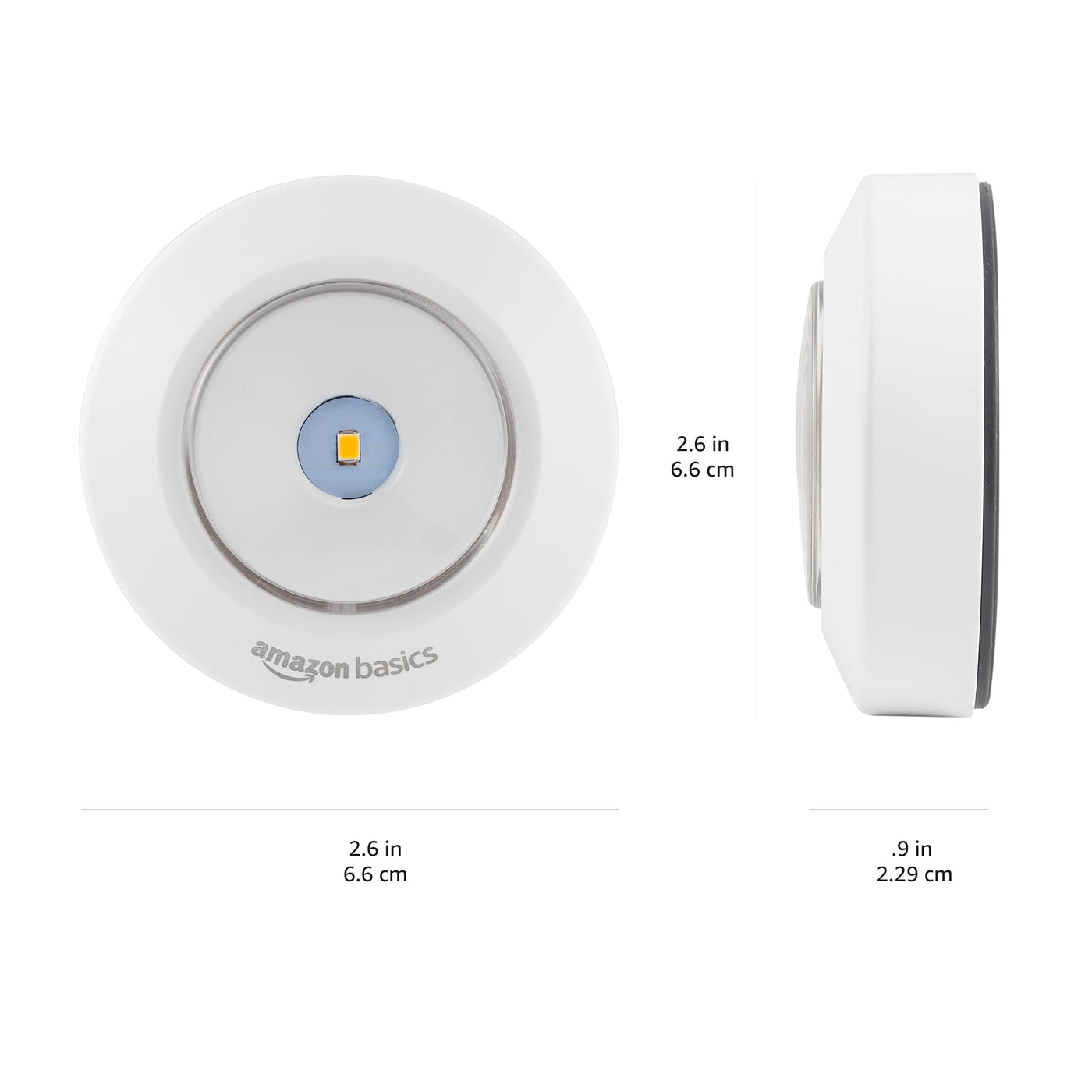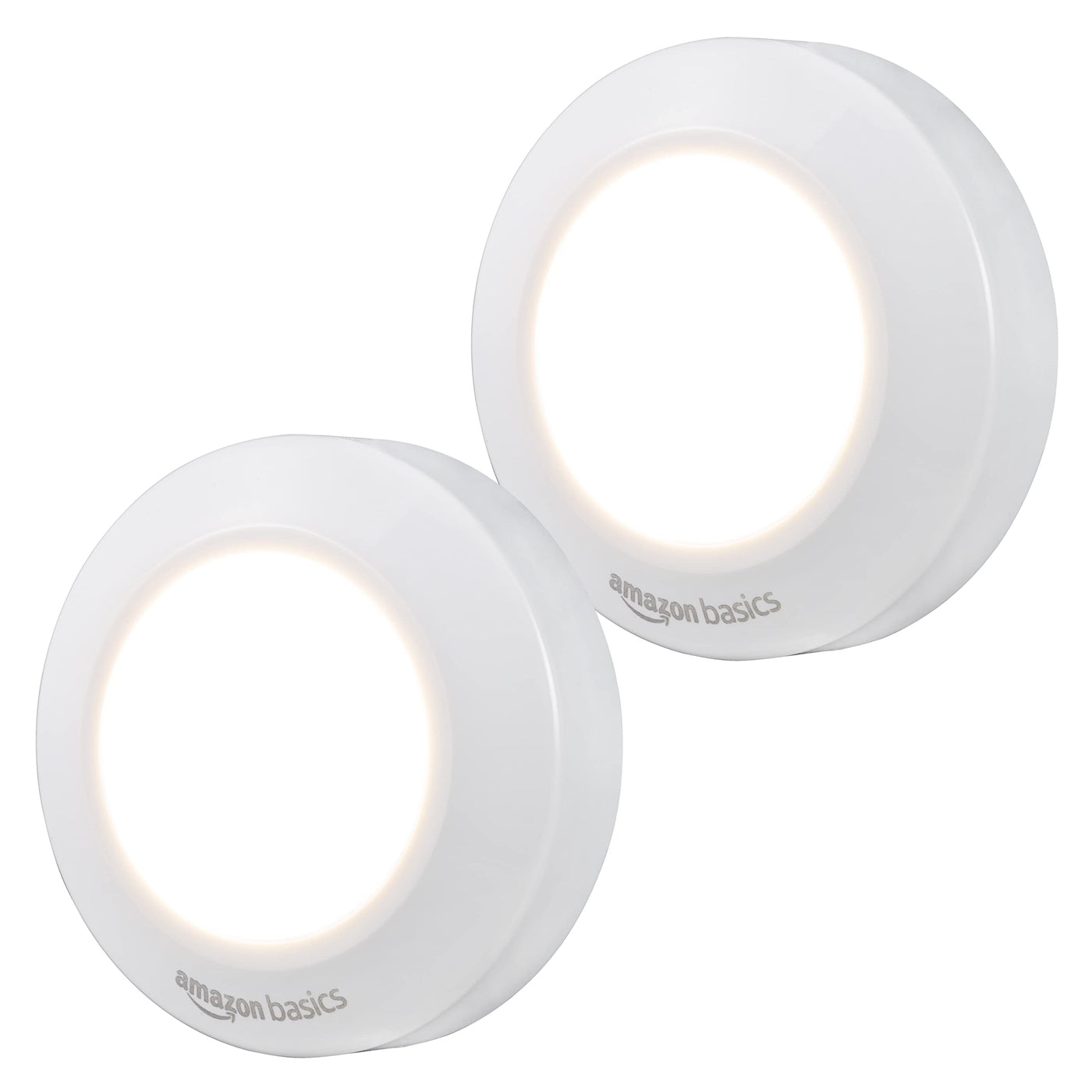 Amazon Basics Led Puck Lights, Battery Operated, 50 Lumens 2 Pack, Tap Light, Stick On Lights, Under Cabinet Lighting, Ideal For Kitchen Cabinets, Closets, Garage And More, White