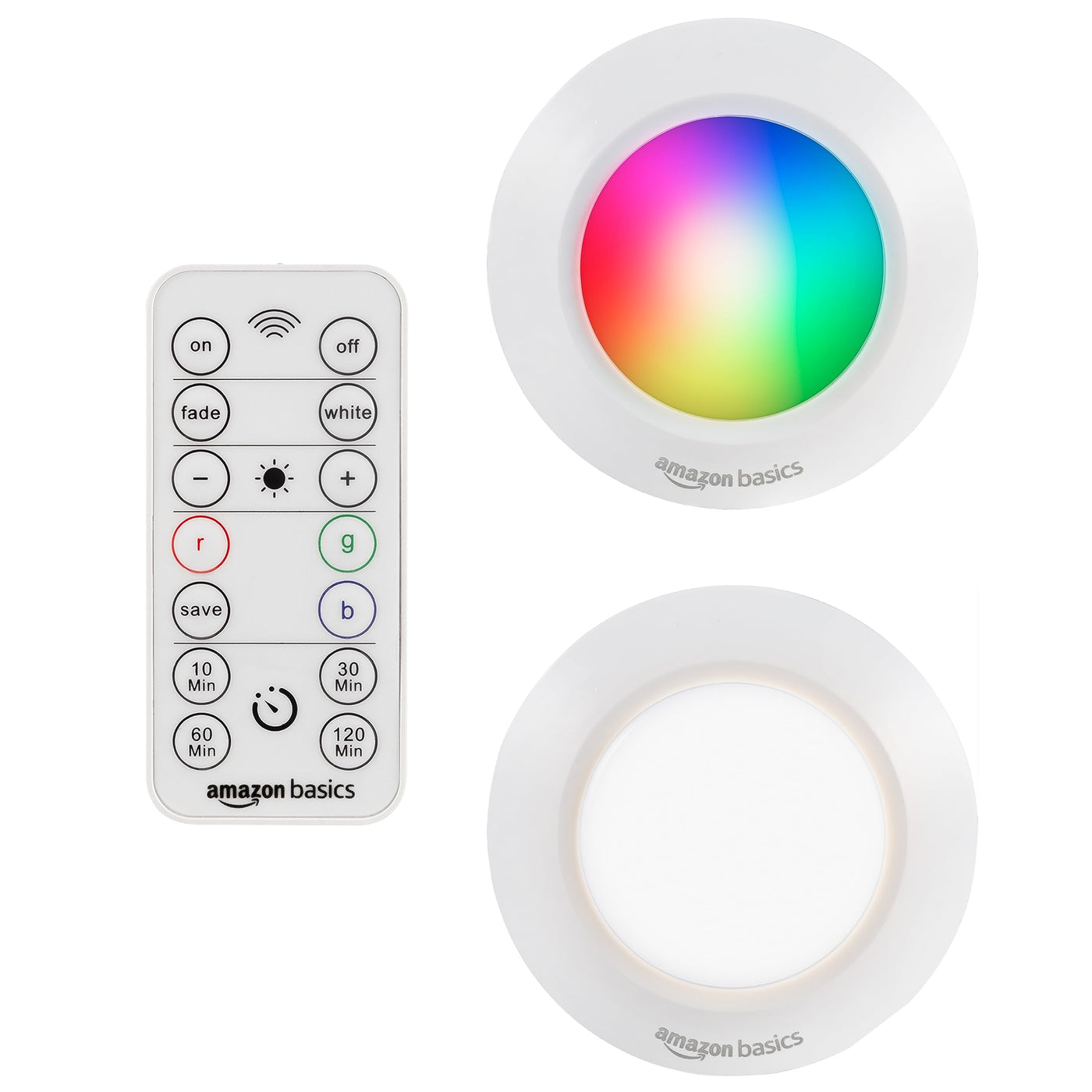 Put a pop of color in your space with the Amazon Basics Color-Changing LED Puck Light. With the easy-to-use IR remote, you can access dozens of vibrant colors, including dimmable white, to customize the look you want. Color-fade mode automatically cycles through each color option while pressing the RGB buttons lets you choose your favorite from across the entire spectrum. You can even save your favorite color for later! The 4 timer options include 10-, 30-, 60- or 120-minutes before the puck turns off. Featuring a sleek and compact design. If youre renting, or only want the light installed temporarily, you can use the included double-sided tape! The puck is powered by 3 AAA batteries; ensuring many hours of operation and keeps things wire free and hassle free. Highly versatile and stylish, the Amazon Basics Color-Changing LED Puck Light provides your home with accent lighting both awesome and accessible.
