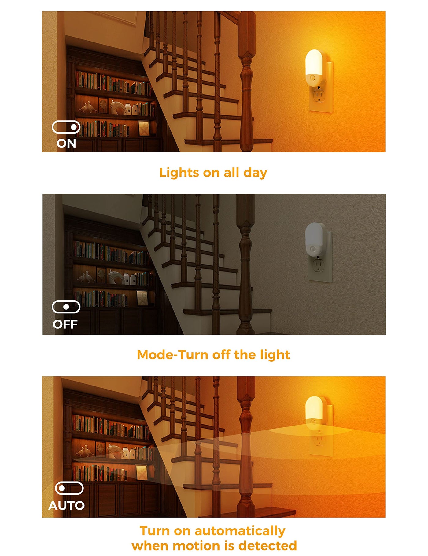 Q: How does the motion sensor work on this night light?A: The night light features a built-in motion sensor that activates the light in 'Auto' mode. It can detect motion within a range of 3-5 meters at a 120° angle, turning on automatically when motion is detected and turning off after 60 seconds of inactivity.