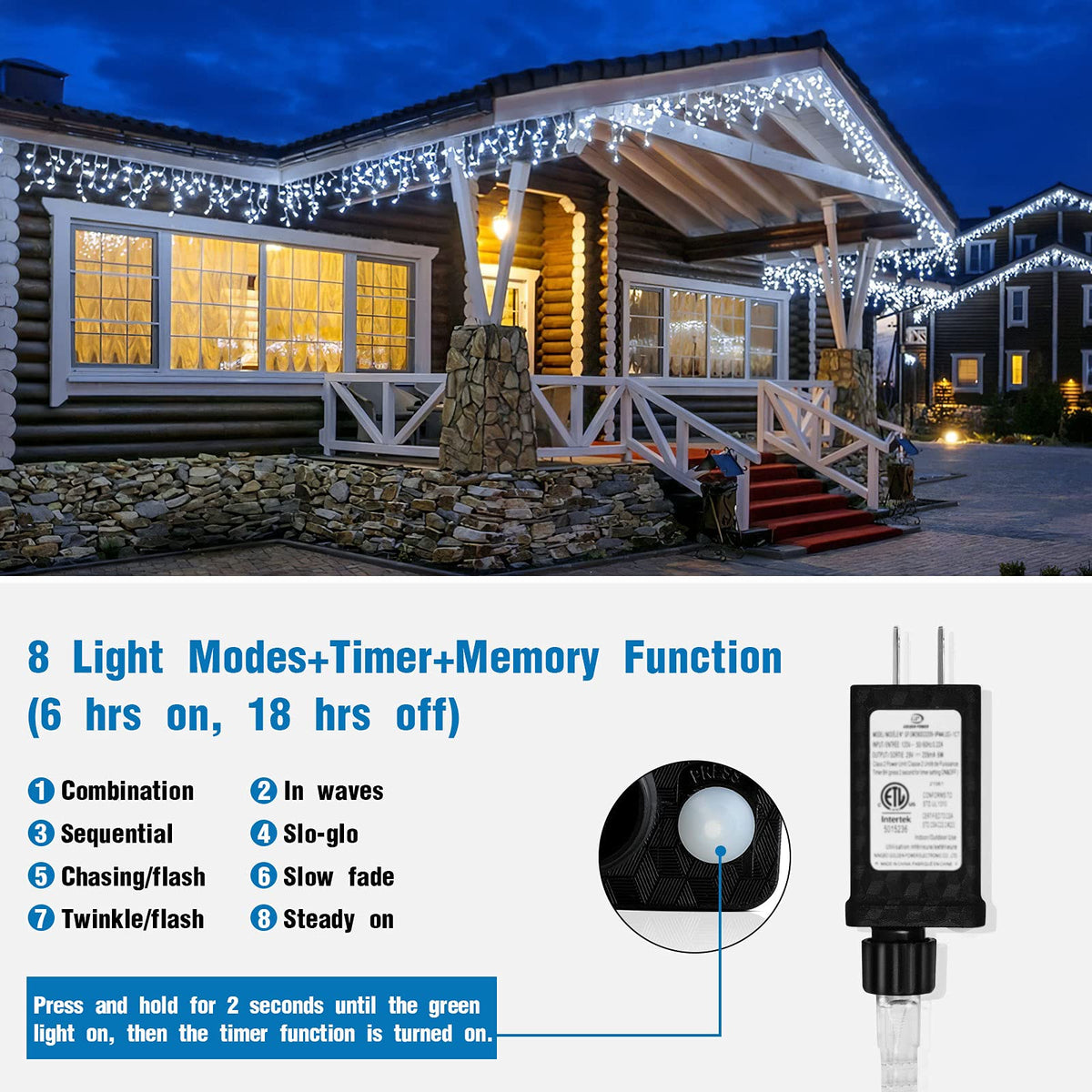 Q: Is there a timer function on these icicle lights?A: Yes, the icicle string lights come with a timer function. By pressing and holding the button on the transformer for 2 seconds, you can enable the timer, which operates for 6 hours on and 18 hours off in a daily cycle.