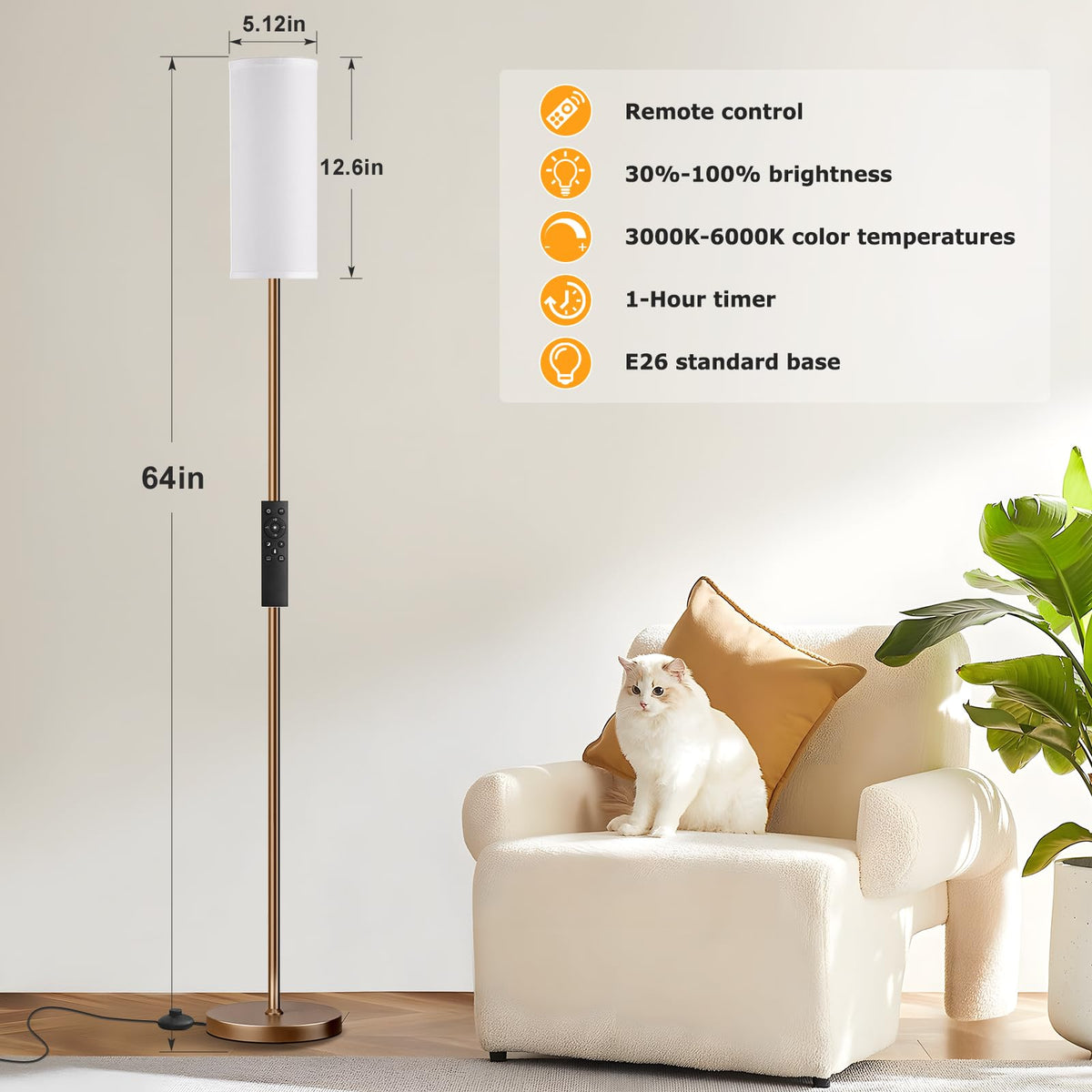 Ambimall 64'' Floor Lamps For Living Room With Remote Control And Stepless Dimmable Colors Temperature & Brightness, 9W Bulb Included(White Lampshade & Brown Pole)