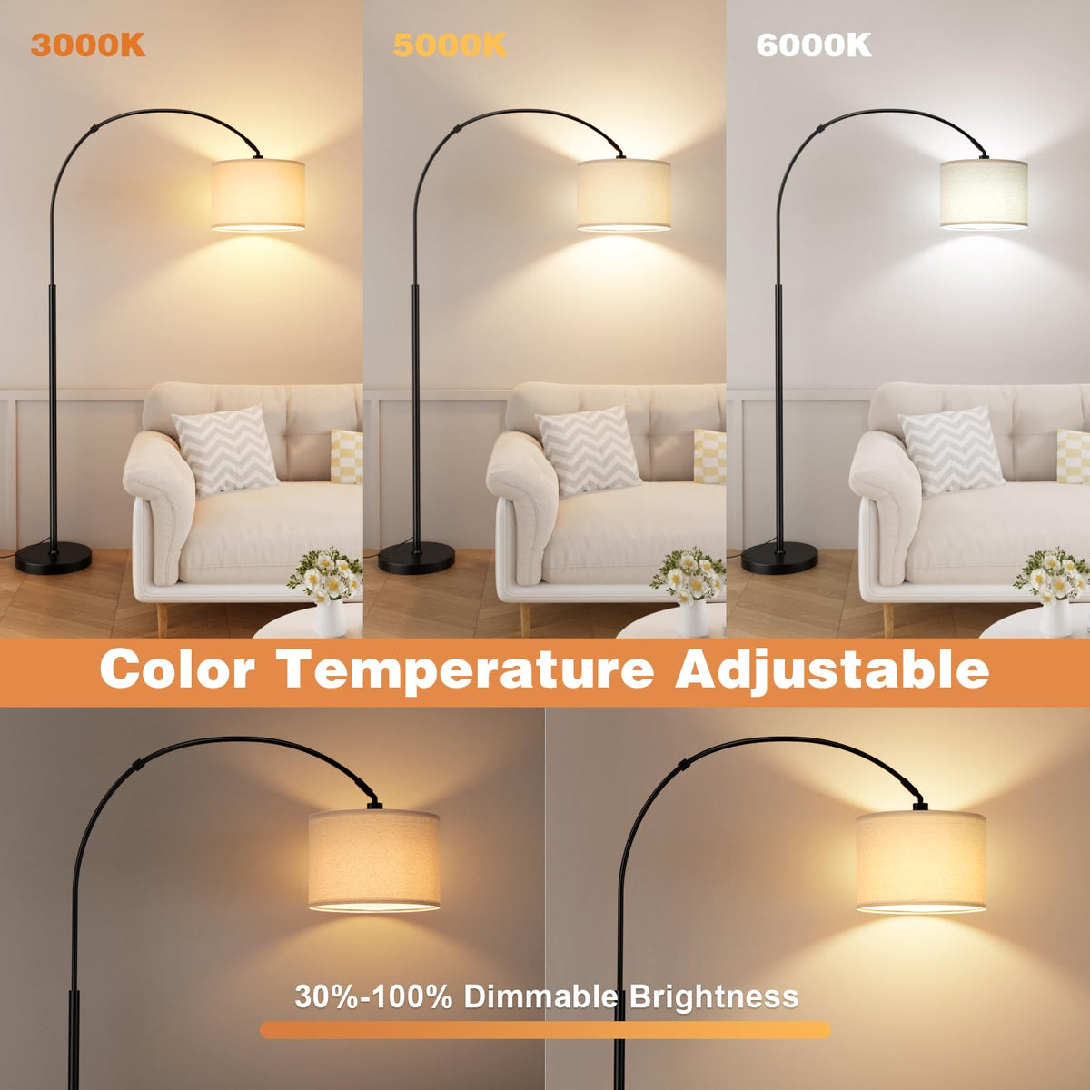 Q: What are the color temperature options available with this floor lamp?A: The Ambimall Dimmable Arc Floor Lamp offers three color temperature options: Warm White (3000K), Natural White (4500K), and Cool White (6000K), allowing you to set the perfect mood for any occasion.