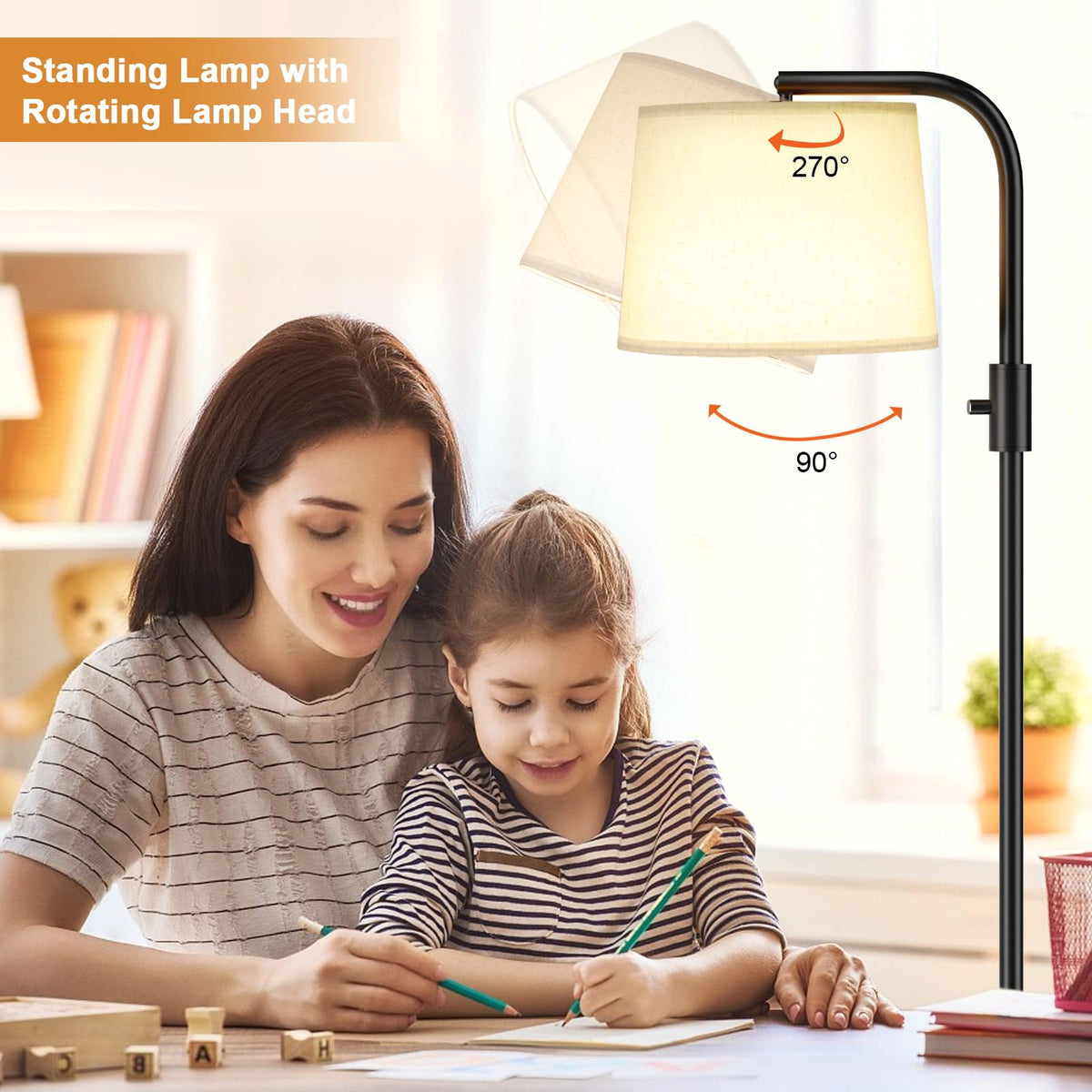 Q: Does the lamp have an adjustable lamp head?A: Yes, the lamp head of the Ambimall Floor Lamp features 270º horizontal rotation and 90º vertical adjustment. This allows you to direct the light exactly where you need it, making it versatile for various activities such as reading or working.