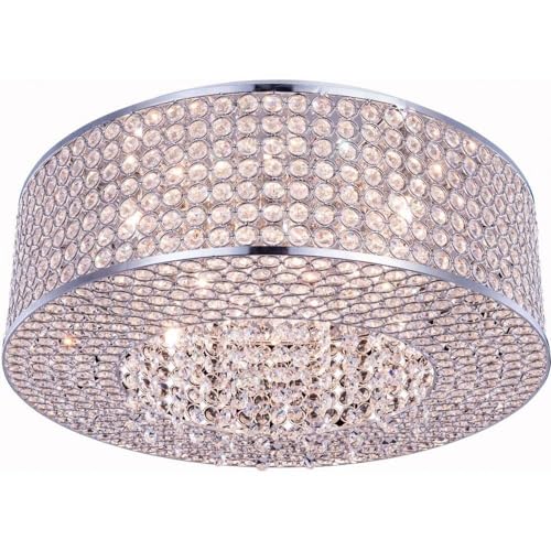 Like a brilliant shining star, the Amelie collection of flush-mount fixtures emits dazzling light from a bejeweled circular band, accented with gleaming strands of royal-cut crystals pouring through the open center. The chrome-finished ring surrounds four to 10 lights (not included) that highlight intricate pattern of miniature circles that embellish the sides and bottom of the frame. In natural light, or with electricity, this sparkling flush-mount light would become a stunning showpiece for your space. Room use: Dining room; Living room; Bedroom; Bathroom; Entry Way; Closet Fixture is 20 inches in diameter and 6 inches in height Warm, brilliant light is created by 8 light bulbs. (not included). Dining Room/Living Room/Bedroom/Bathroom/Entry Way/Closet2 Years / Mounting Direction: Down / Assembly Required: Yes / Canopy Included: Yes / Shade Included: Yes.