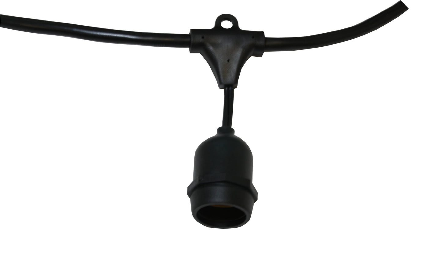 American Lighting LS-MS-24-100-BK Commercial Grade Light String, Medium Base Suspended, 100-Foot. 100-foot commercial grade light string - Medium base suspended. Adds festive lighting to indoor and outdoor areas such as patios, building outlines, tents and gazebos. Factory-molded sockets on 14-gauge wire suitable for commercial applications. Formulated PVC sockets form a tight weatherproof seal around the bulb. Available in bulk reels in candelabra, intermediate and medium base sockets.