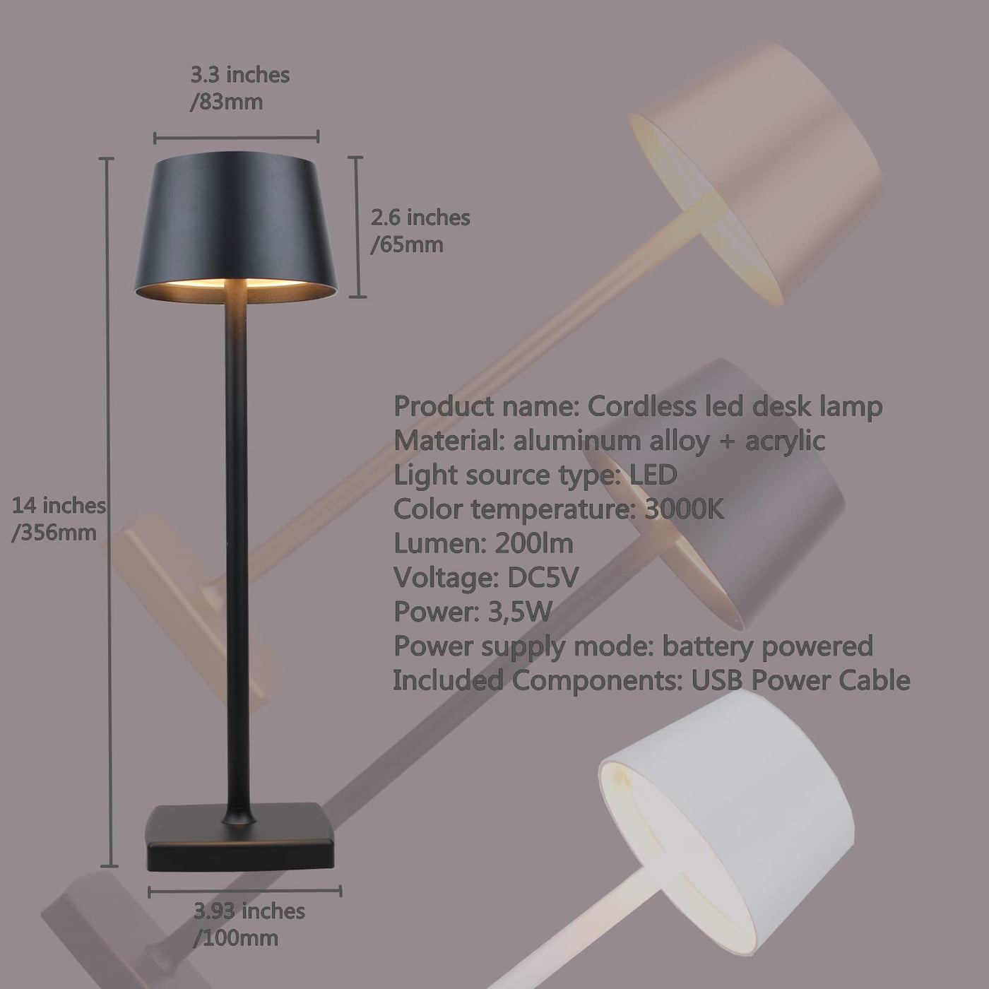 'Product Name: Led Cordless Table Lampbrand: Amhshkoustyle: Minimalistchange Method: Touchpower-Off Method: Touchcolor: Black/Gold/Whitecharging Method: Usbcharging Cable Length: About 1.2 Metersbattery Capacity: Built-In 5200Mahlight Source: Ledcolor Temperature: 3000Kvoltage: Dc5Vshade Material: Aluminum Alloyproduct Size: 100X356Mmweight: 822 Gramspacking Size: 140X135X393Mmweight: 1080Gwaterproof Rating: Ip54 Waterproofce/Rohs/Msds Report Certificationreminder: Due To Manual Measurement, There May Be An Error Of 1-2Mm.Due To Different Monitor Resolutions, The Colors May Be Slightly Different.''