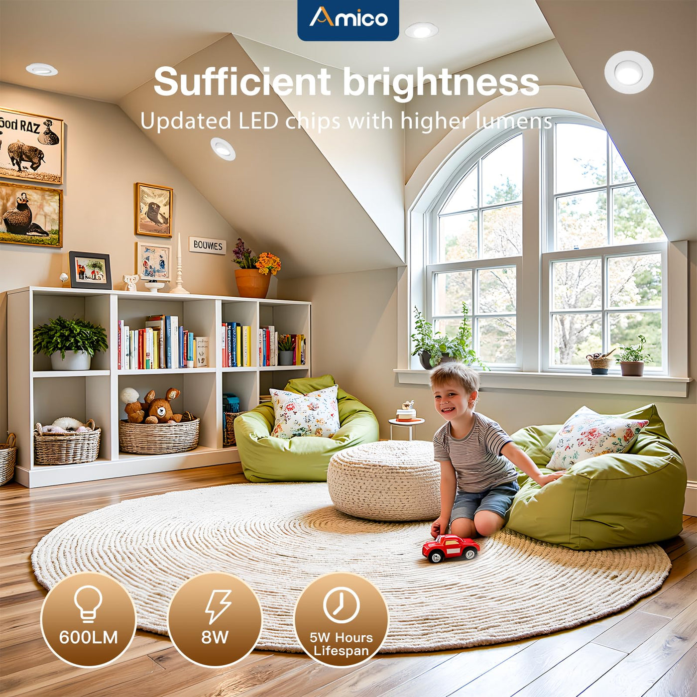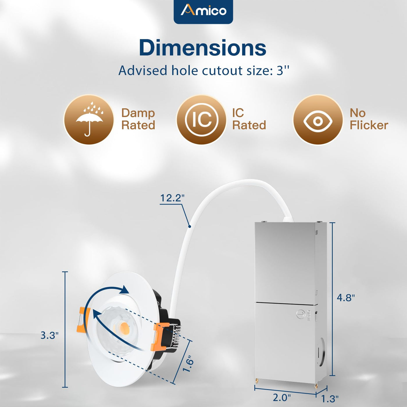 Q: Are the Amico recessed lights dimmable?A: Yes, the Amico 12 Pack 3 Inch Eyeball LED Recessed Lights are dimmable, giving you the flexibility to adjust the brightness to suit your needs and create the perfect ambiance in your space.