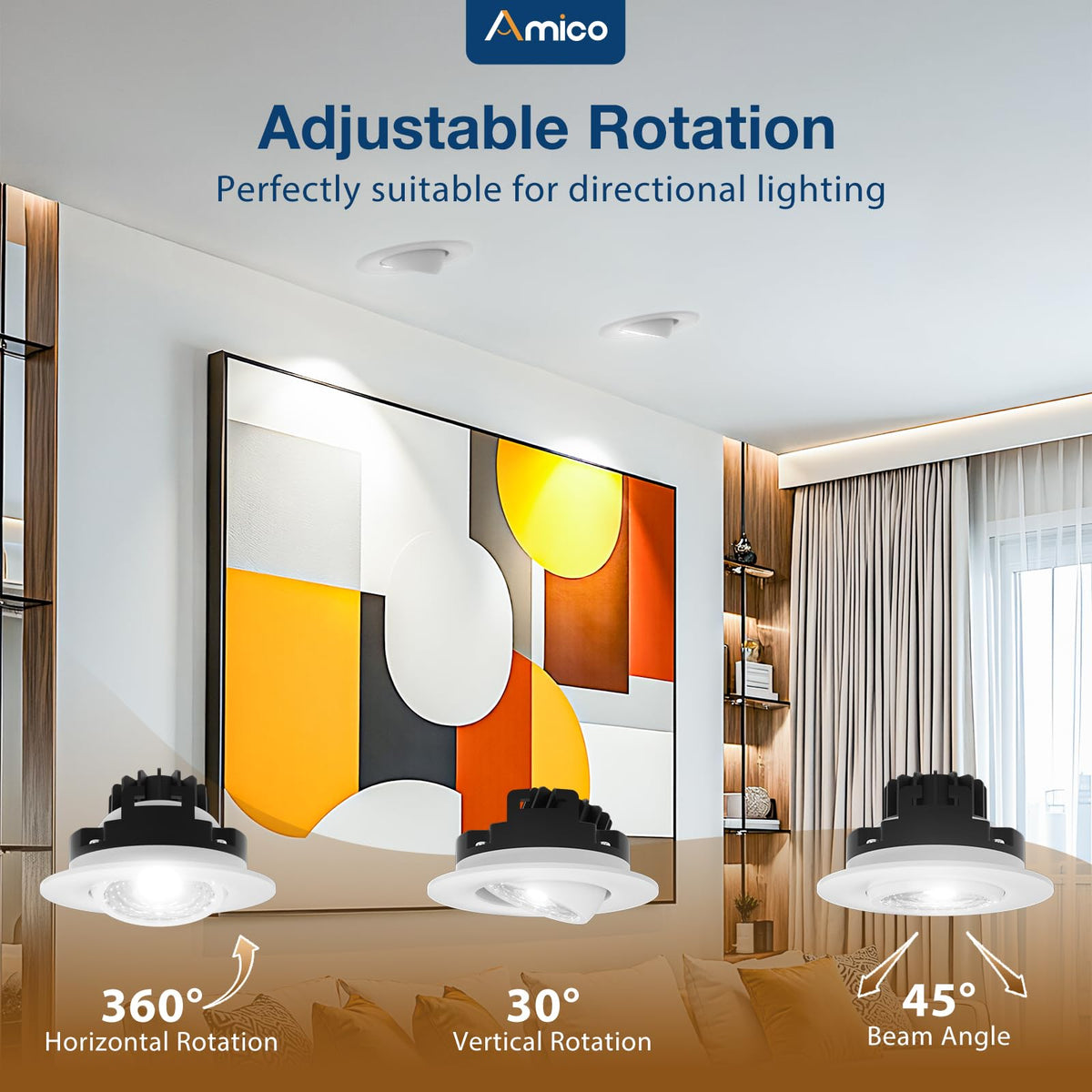 Q: How do I adjust the angle of the Amico gimbal recessed lights?A: The Amico gimbal recessed lights support 360° horizontal rotation and up to 30° vertical rotation, allowing you to easily adjust the lighting angle to highlight artwork, murals, or any other areas in your room.
