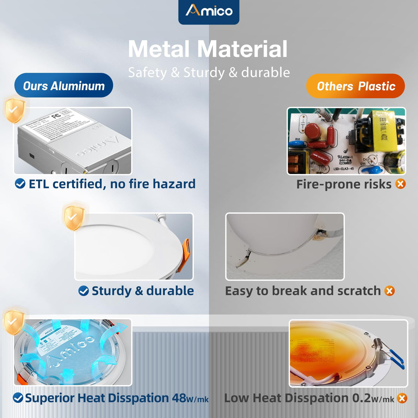 Q: Is the Amico recessed light safe for use in insulated ceilings?A: Yes, the Amico recessed light is IC rated, meaning it is safe for installation in contact with insulation in ceilings. This feature ensures that the junction box is thermally protected and significantly reduces the risk of fire hazards associated with traditional lighting.