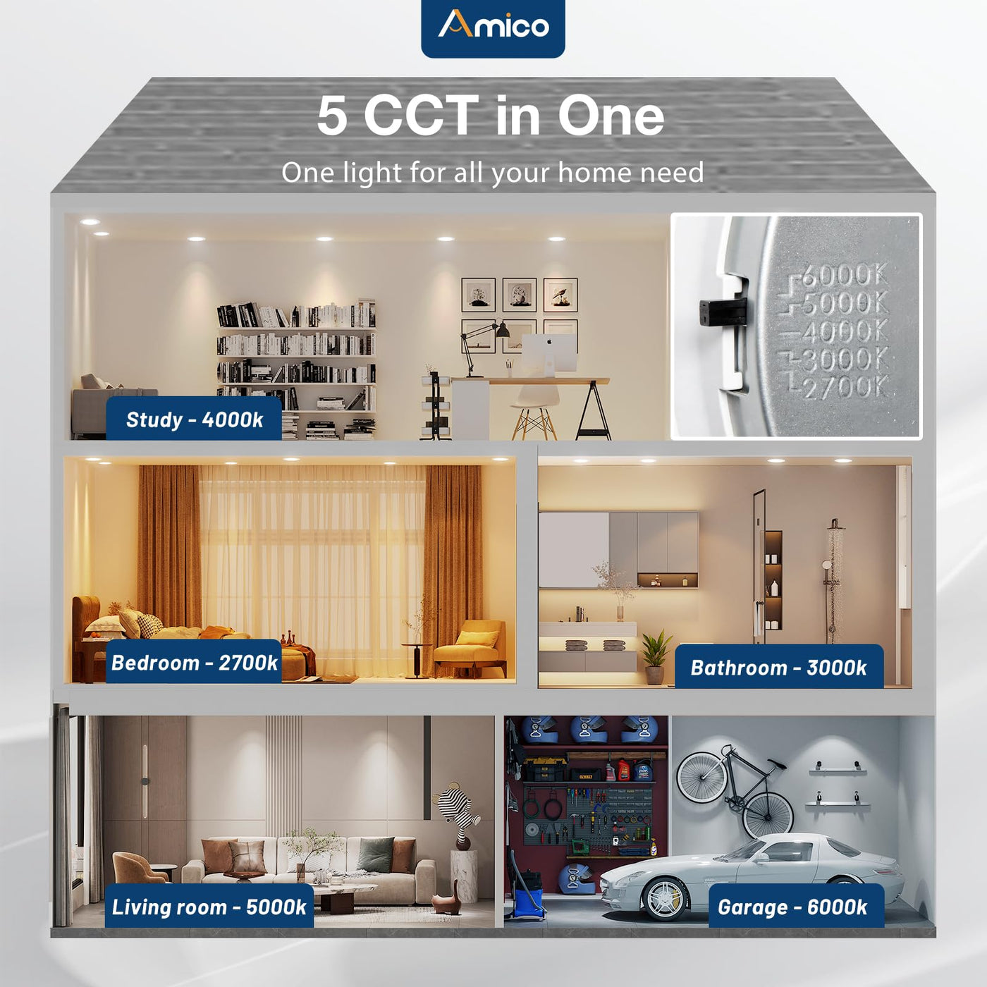 Q: Can I dim these LED recessed lights?A: Absolutely! The Amico recessed lights feature smooth dimming capabilities, allowing you to adjust the brightness from 5% to 100%. This makes them ideal for creating the perfect ambiance in various settings like kitchens, living rooms, or bedrooms.