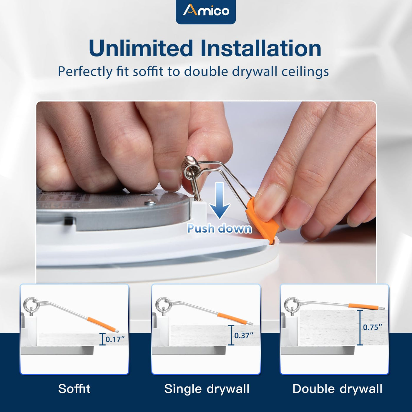 Q: How do I install the Amico recessed lights?A: Installation is straightforward: first, cut a hole in the ceiling using the provided 1:1 hole template. Then, connect the junction box to the electrical cable and use the spring clips to secure the lights in place. The entire process can typically be completed in just a few minutes.