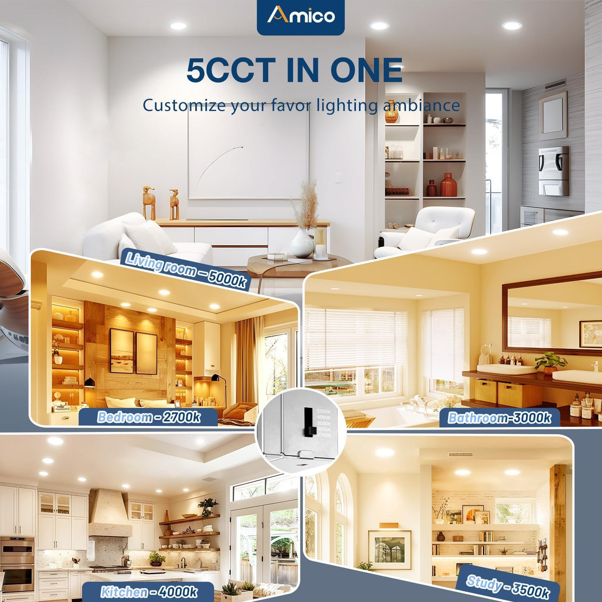 Amico 12 Pack 6 Inch Cri90+ 5Cct Ultra-Thin Led Recessed Ceiling Light, 2700K-5000K Selectable, 1100Lm 15W, High Brightness Dimmable Canless Wafer Downlight - Etl&Fcc&Ic