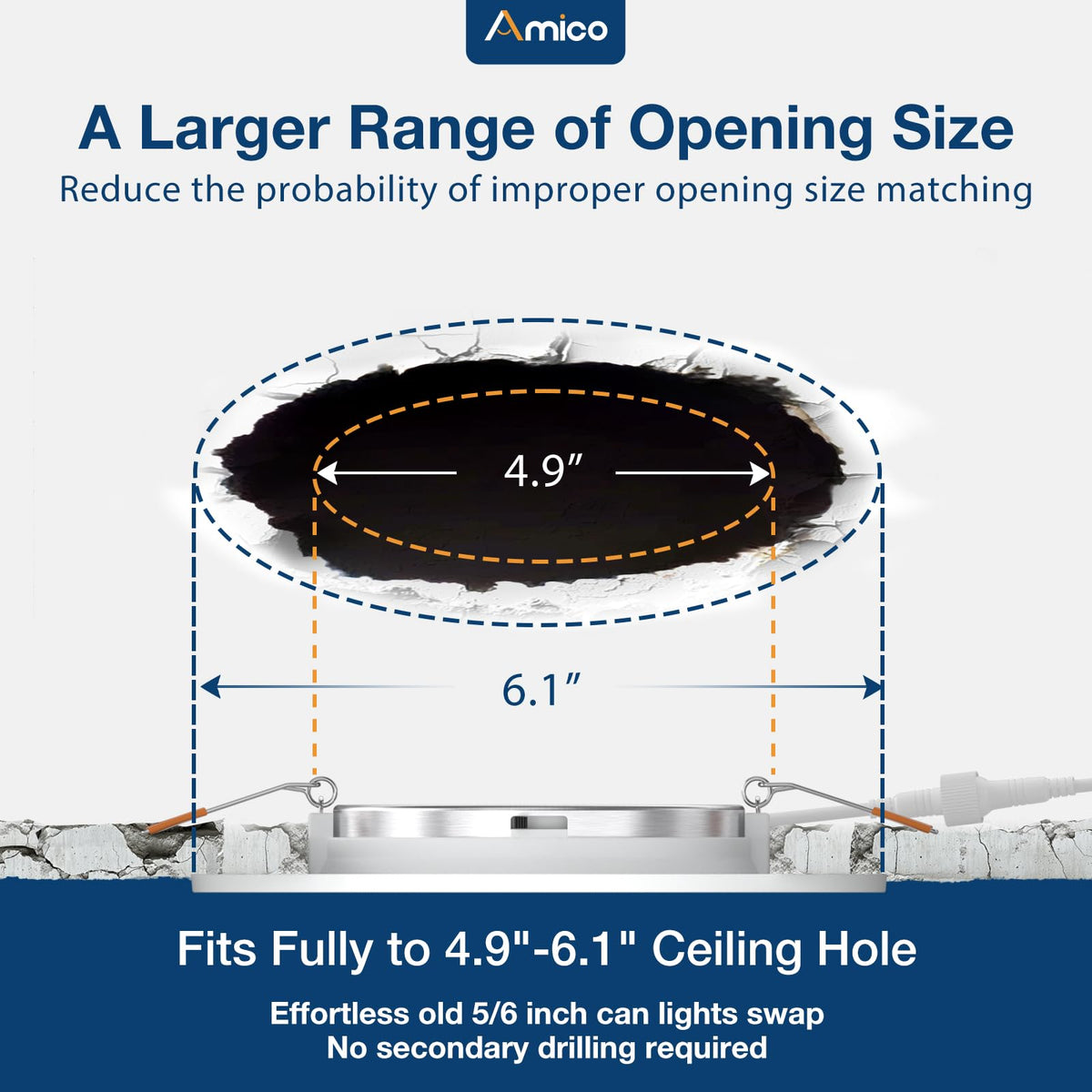 Q: What is the brightness level of the Amico recessed lights?A: The Amico 6 Inch Ultra-Thin LED Recessed Lights provide high brightness at 1000 lumens while consuming only 12 watts of power. This efficiency allows you to save up to 90% in energy costs compared to traditional 110W halogen lamps.