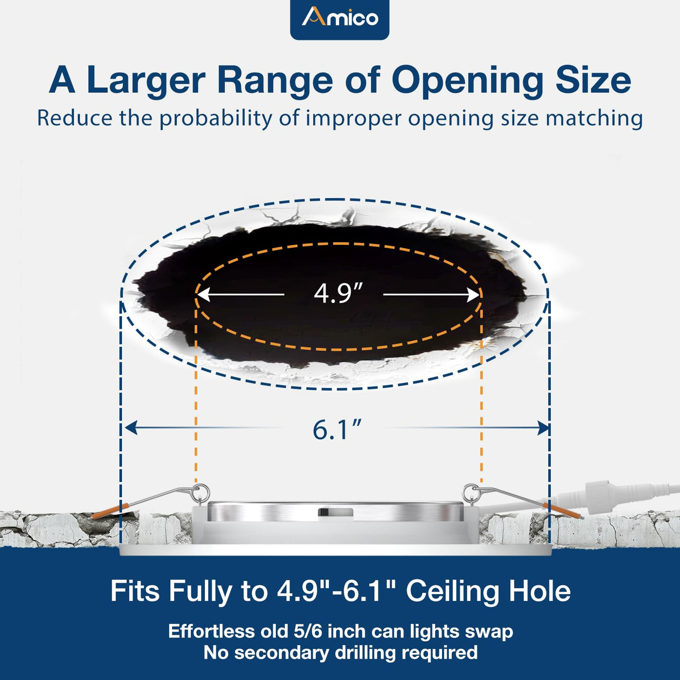 Q: How easy is it to install the Amico recessed lights?A: Installation of the Amico recessed lights is straightforward and can be completed in minutes. Simply cut a hole in the ceiling using the provided template, connect the junction box to the cable, and use the spring clips to secure the lights in place.