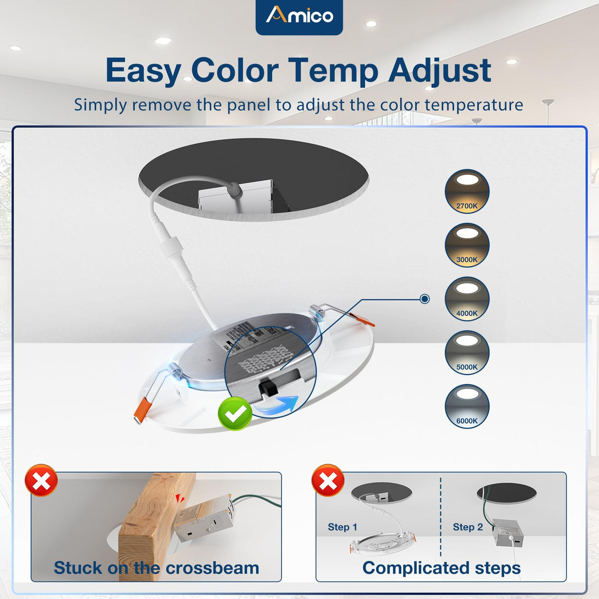 Q: What color temperatures are available for the Amico 6 Inch Ultra-Thin LED Recessed Lights?A: The Amico 6 Inch Ultra-Thin LED Recessed Lights offer five selectable color temperatures: 2700K, 3000K, 4000K, 5000K, and 6000K. You can easily switch between these options using the convenient switch on the side of the junction box.