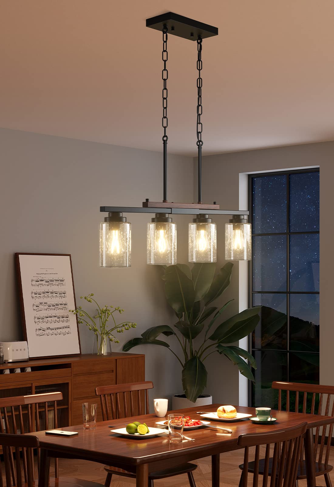 Amico 4-Light Black Metal & Wood Dining Room Chandelier With Seeded Glass Pendant Light