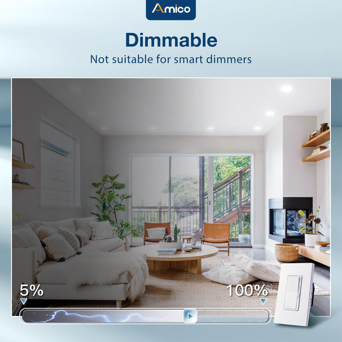 Q: Are the Amico LED recessed lights compatible with dimmers?A: Yes, these flat can lights are compatible with most dimmers available on the market, except for smart dimmers. You can smoothly adjust the brightness from 5% to 100% for optimal eye comfort.