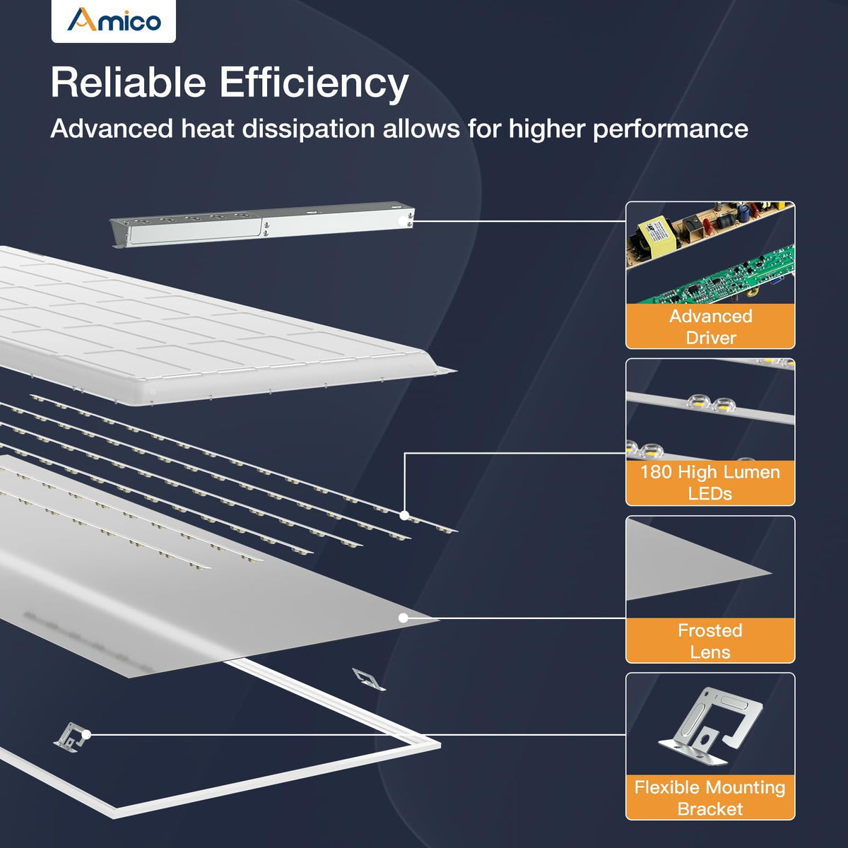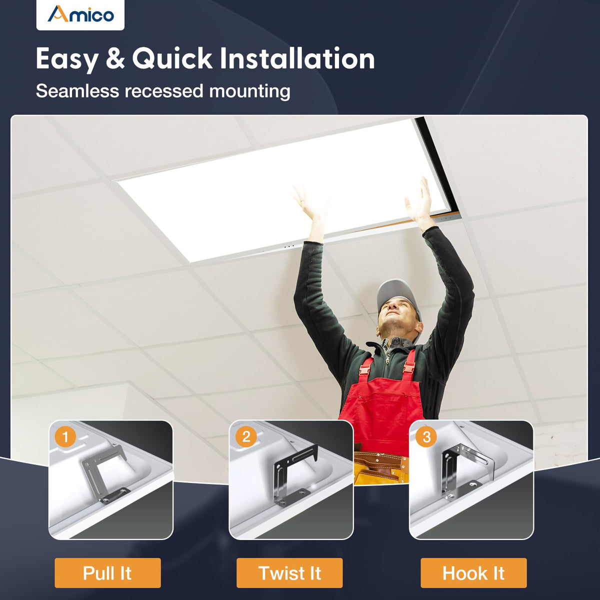 Q: How easy is it to install the Amico 2x4 LED Flat Panel Light?A: The Amico LED Flat Panel Light is designed for easy installation. It fits standard 2x4 drop ceiling grids and can be mounted without any additional tools, making it a convenient choice for various settings.