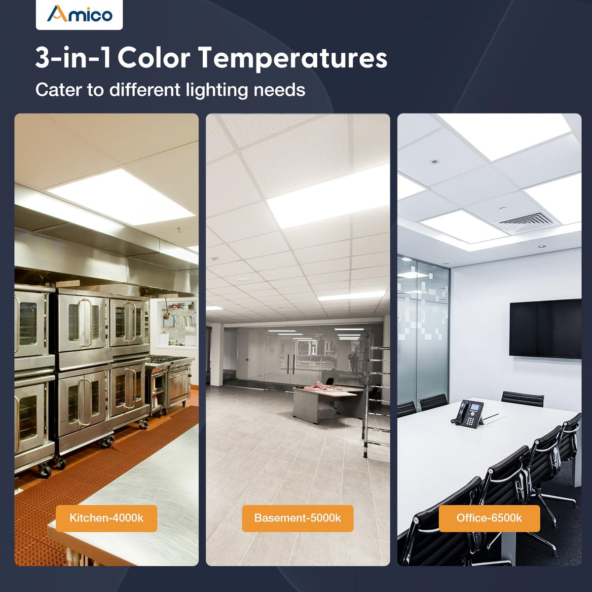 Q: What color temperatures are available for this LED Flat Panel Light?A: The Amico LED Flat Panel Light comes with a 3CCT option, allowing you to select from three color temperatures: 4000K, 5000K, and 6500K, to customize the lighting for your space.