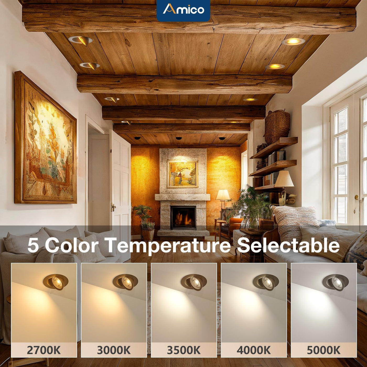 Amico 6 Pack 4 Inch 5Cct Gimbal Led Recessed Lighting 360&90Adjustable Eyeball Directional Downlight Dimmable 2700K/3000K/3500K/4000K/5000K Selectable 9W 700Lm Cri90+ Black Etl&Fcc