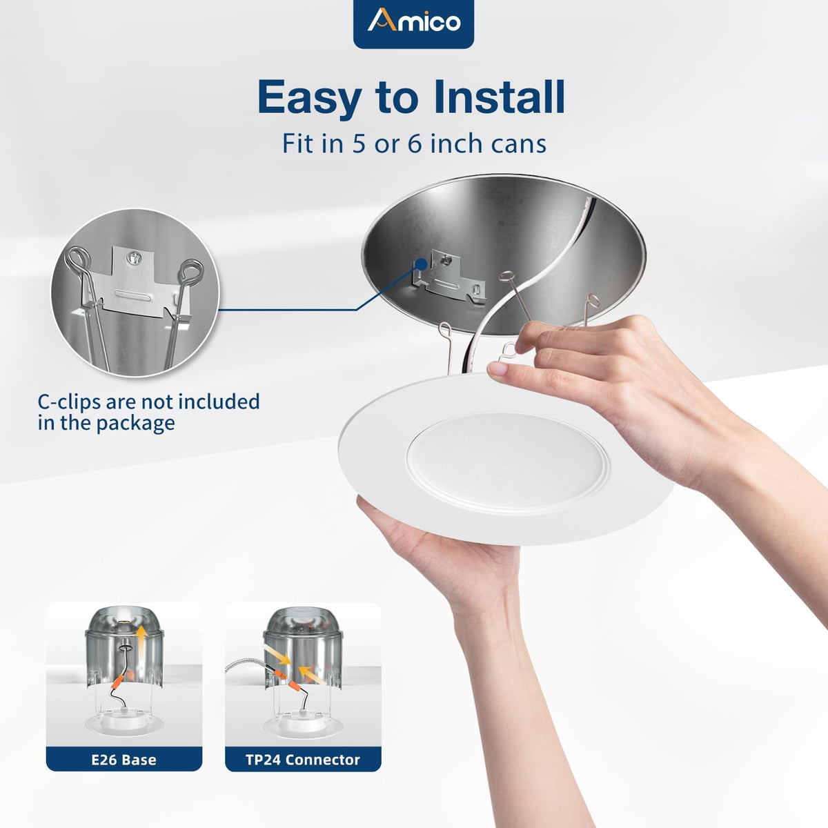 Q: How easy is it to install the Amico LED recessed lights?A: Installation of the Amico LED recessed lights is straightforward, taking only about 3 minutes. With a universal E26 base, you can install them without the need for an electrician.