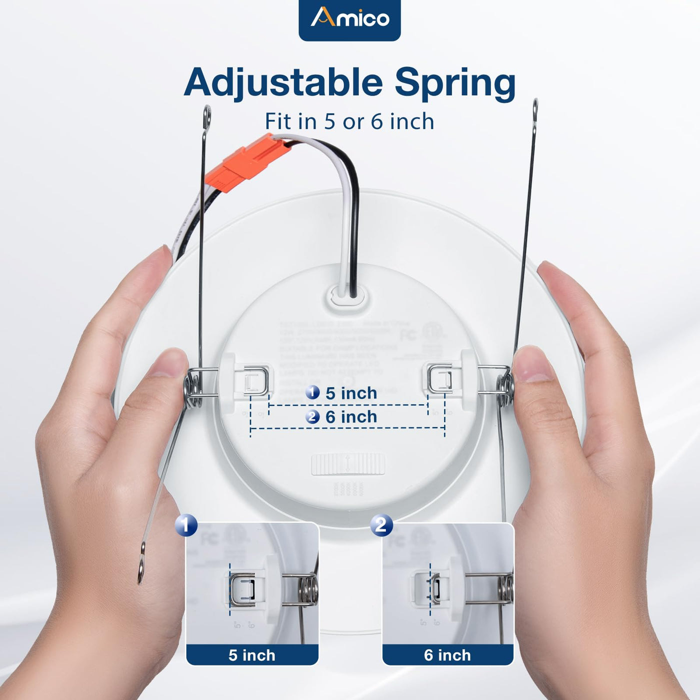 Q: What size can lights can the Amico 5CCT LED lights fit?A: The Amico 5CCT LED recessed lights are designed to fit both 5-inch and 6-inch cans, thanks to their adjustable spring design, ensuring a perfect fit for your needs.