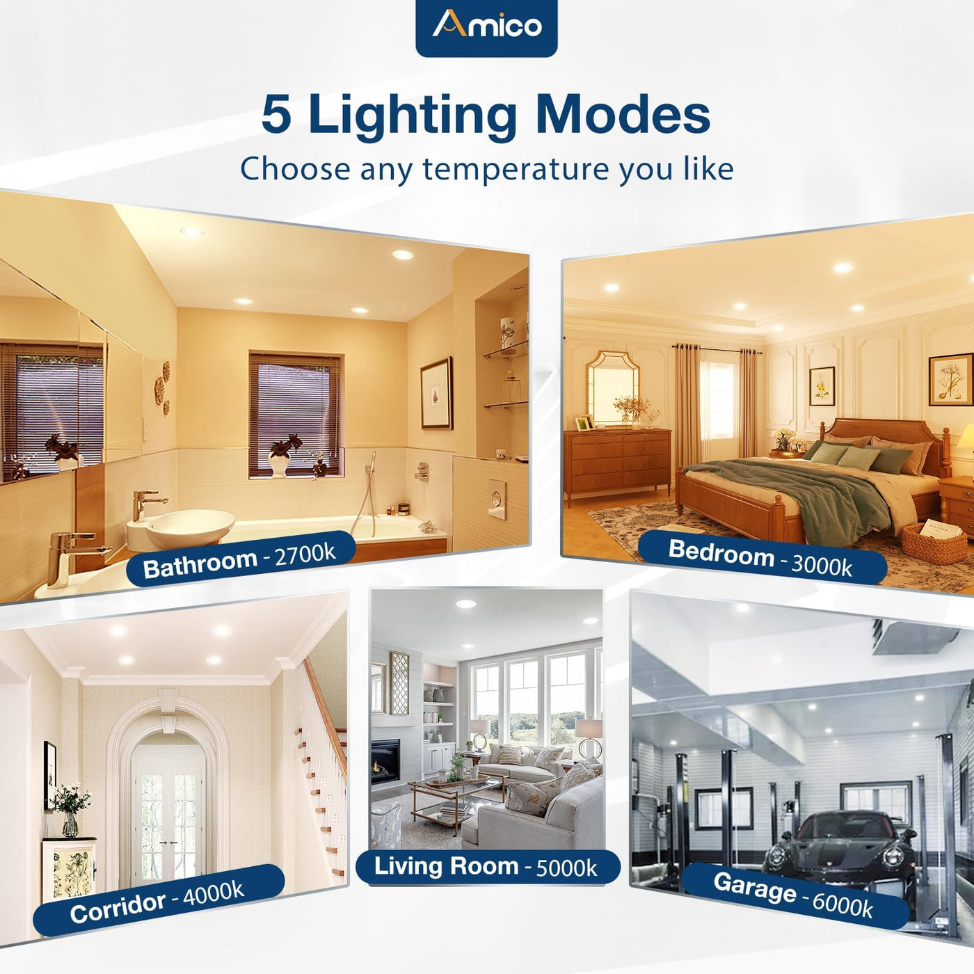Q: What are the available color temperatures for the Amico 5CCT LED Recessed Lighting?A: The Amico 5CCT LED Recessed Lighting offers five selectable color temperatures: 2700K, 3000K, 4000K, 5000K, and 6000K, allowing you to customize the ambiance of your space.