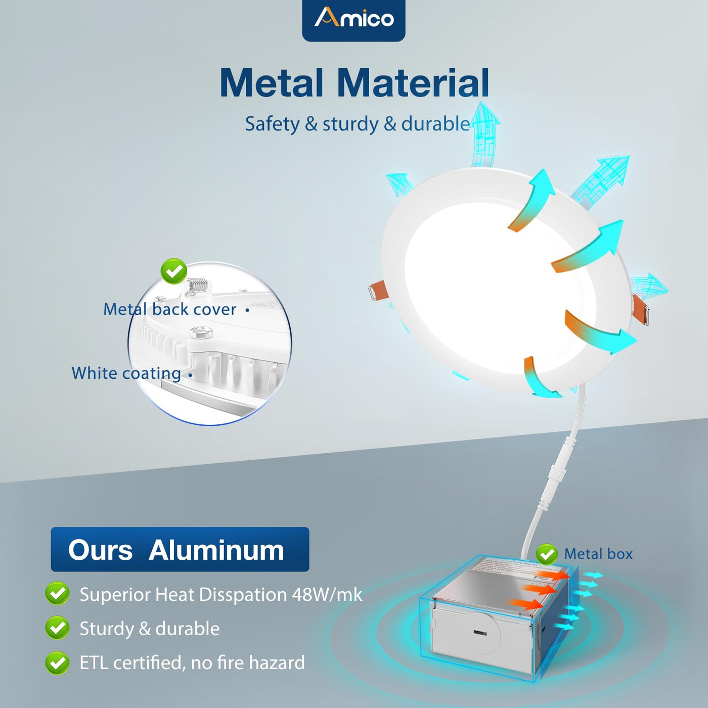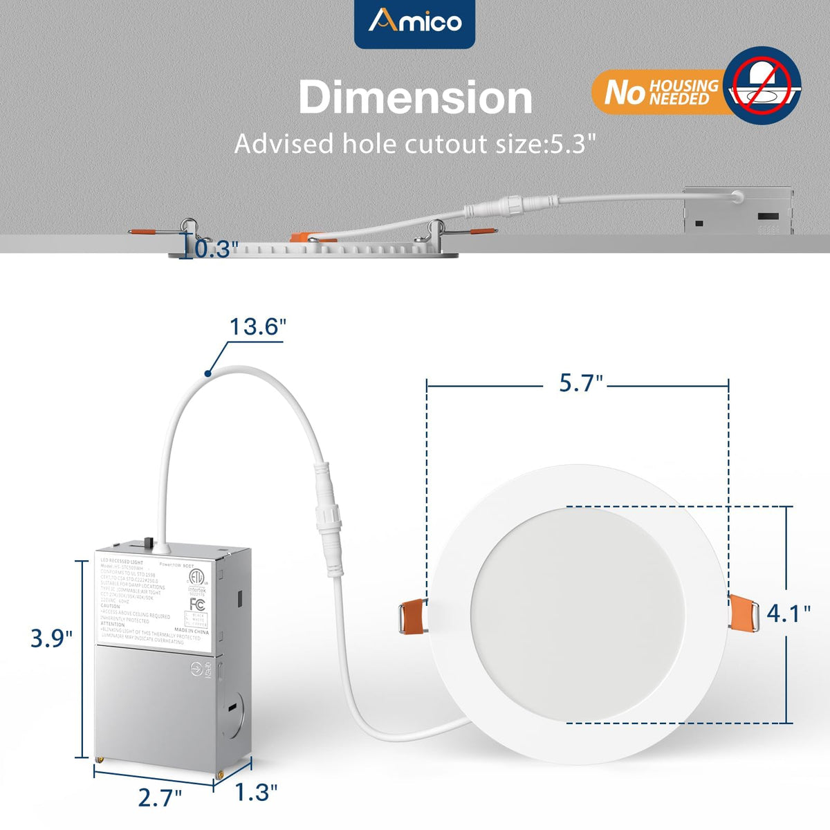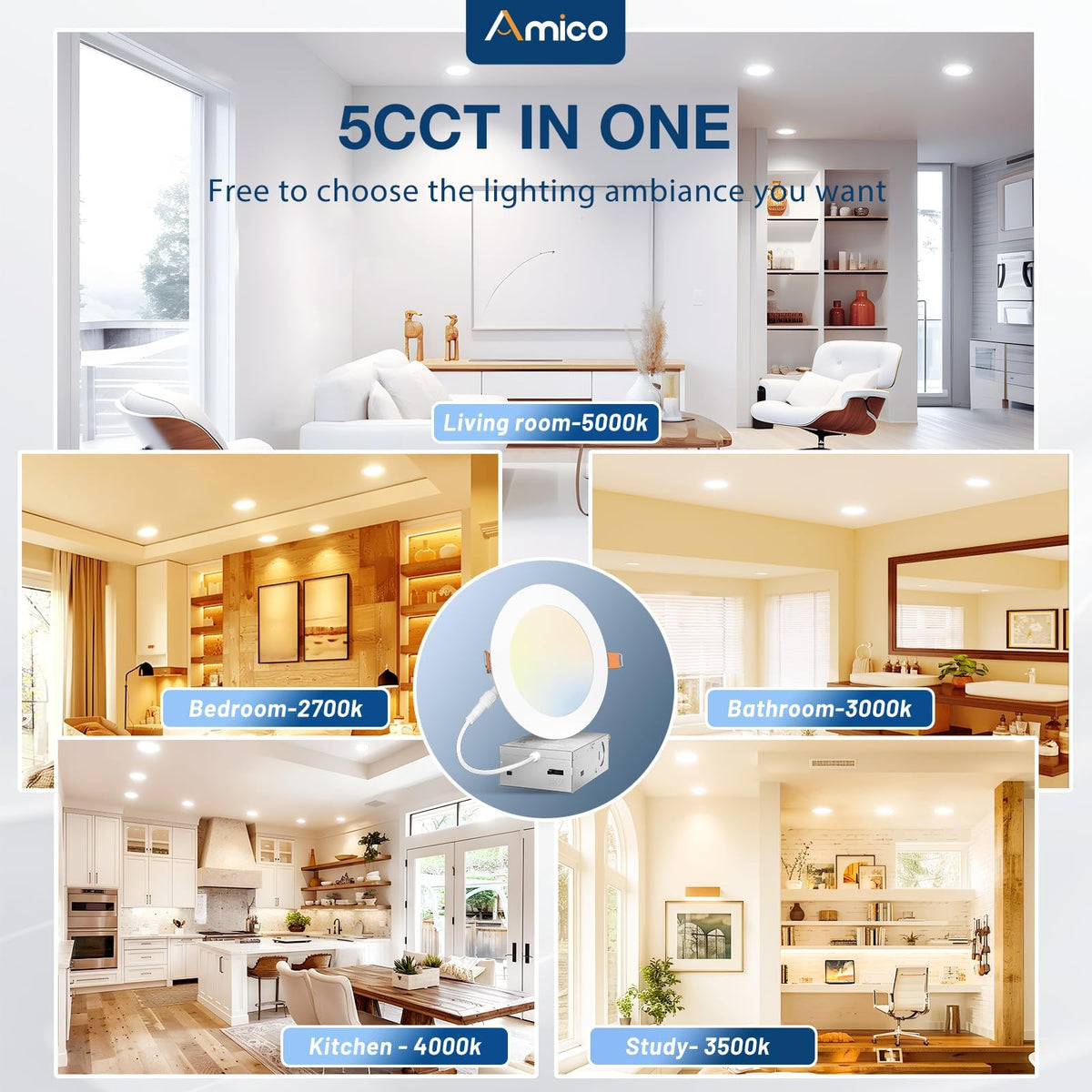 Amico 6 Pack 5 Inch 5Cct Ultra-Thin Led Canless Recessed Ceiling Light With Junction Box, 2700K/3000K/3500K/4000K/5000K Selectab