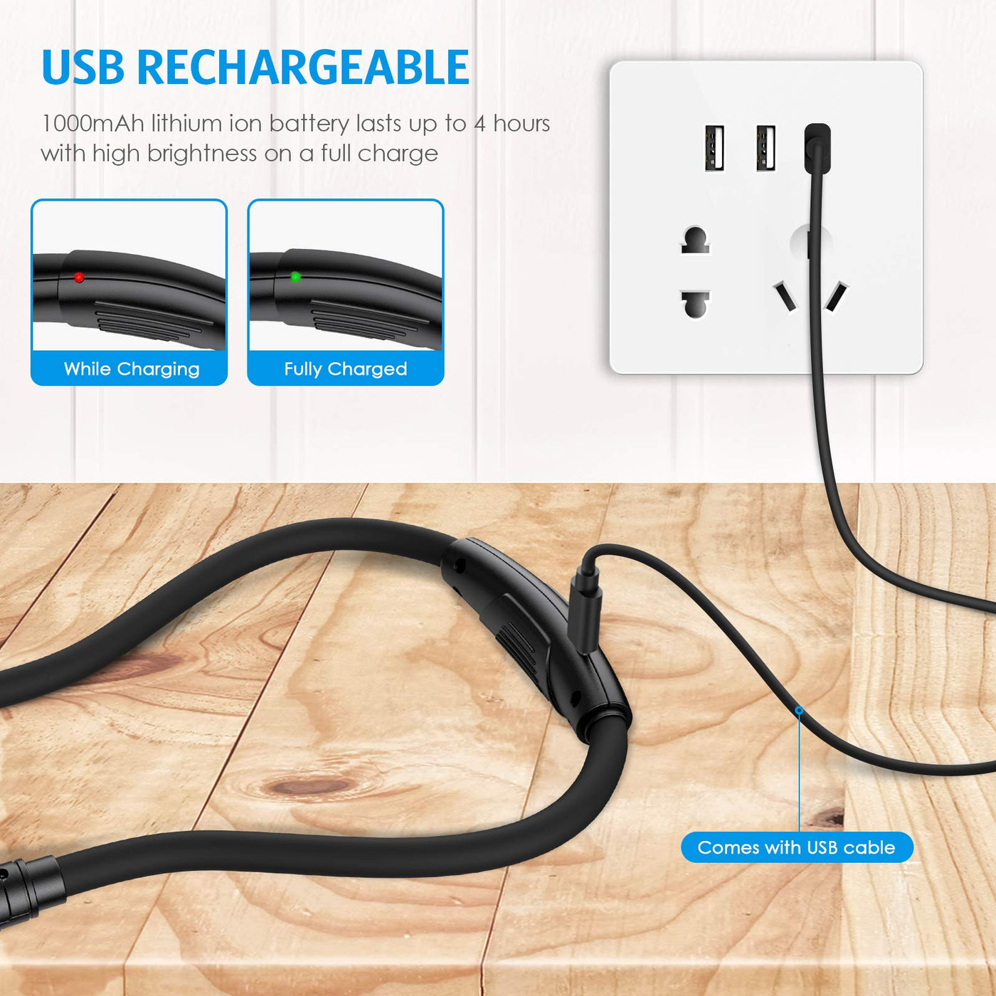 Specifications: Material: ABS+Plastic Weight: 120g Size: 30*30*660mm Voltage: 3.7V Charging time: 2.5H Color temperature:3000K~6000K Lumen: dim light:3LM high light:80LM Rated power:2W Working power:1.26W LED number: 4 LED Lifespan: about 50000hrs Working current: Dim light:6MA High light:260MA Battery:1*1000mAh Package List: 1 x Rechargeable Hands Free Book Light 1 x USB Cable 1 x User Manual
