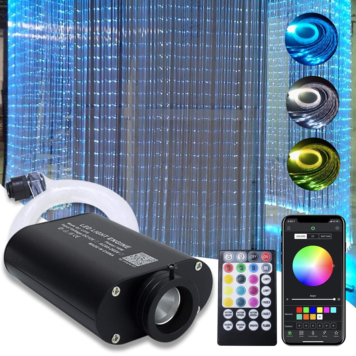 Smart version-APP/Bluetooth controlled Led fiber optic curtain kit. No longer worried about losing your naughty remote!Techincal Specification: Input voltage:AC 110~265V 50/60Hz The fiber cable operation temperature:-58 - 167 Power: 16W Diameter of each fiber: 0.75mm/0.03inQuantity of fiber cables : 300pcs Length of fiber cable : 9.8ft/3mControl mode: APP,remote&musicFiber type: Flash pointRemote type: 28 key RF remote COLOR:RGB (CREE chip) Light body material: Aluminum Lifetime: up to 50,000 hours Light source device size:L115*W95*H55mm Fiber head inner diameter:16-20mm Remote dimension: L85*W52*H7mm Warranty: 2 years Package including:: 1x 16w RGBW light engine source 1x 28key RF remote controller 1x (300pcs*0.75mm*3m) fiber optic cable 1x Power adapter 1x User manual How to download APP? 1.Download APP with your smartphone: My SmartLED;2.Both Android and Apple phones can scan the QR code in the light engine to download the APP;3.If using an Android phone, please download the MY smart LED in Google Play;4.If using an Apple phone, please download the MY smart LED in the Apple Store.Note:Battery included: NOTwinkle function:NO