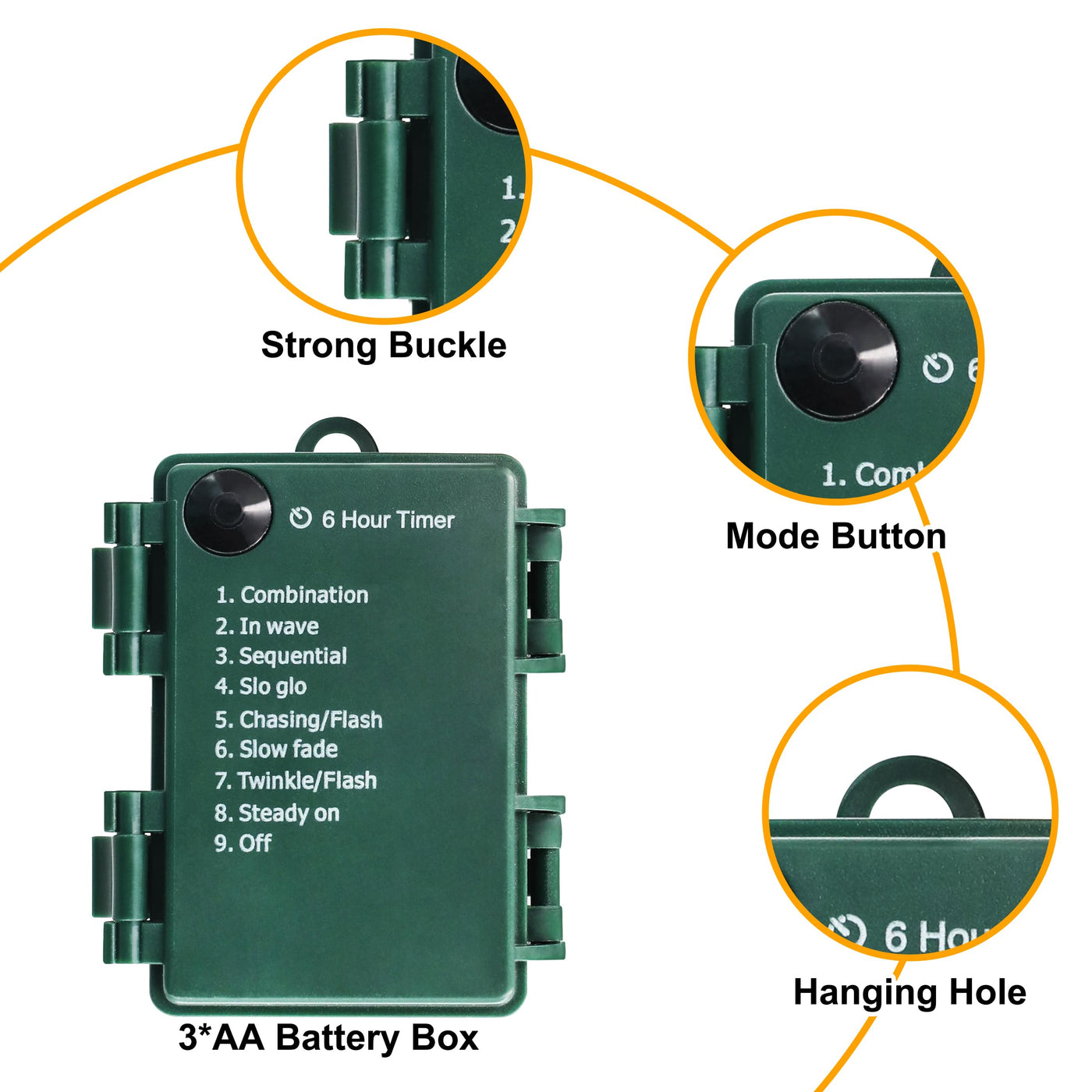 Q: Is there a timer feature for these Christmas lights?A: Yes, the lights come with a built-in timer that operates for six hours on and eighteen hours off, allowing for convenient automatic operation.