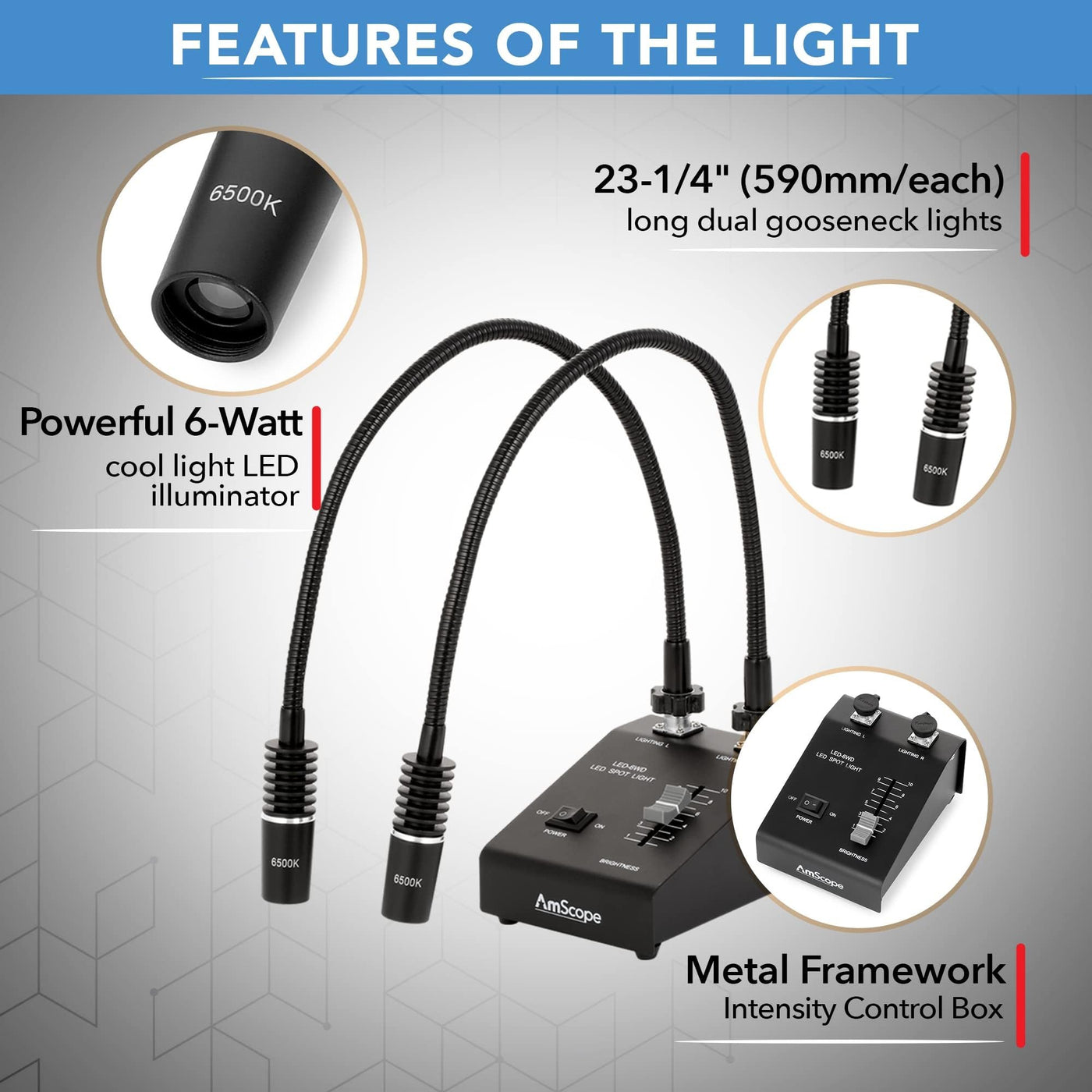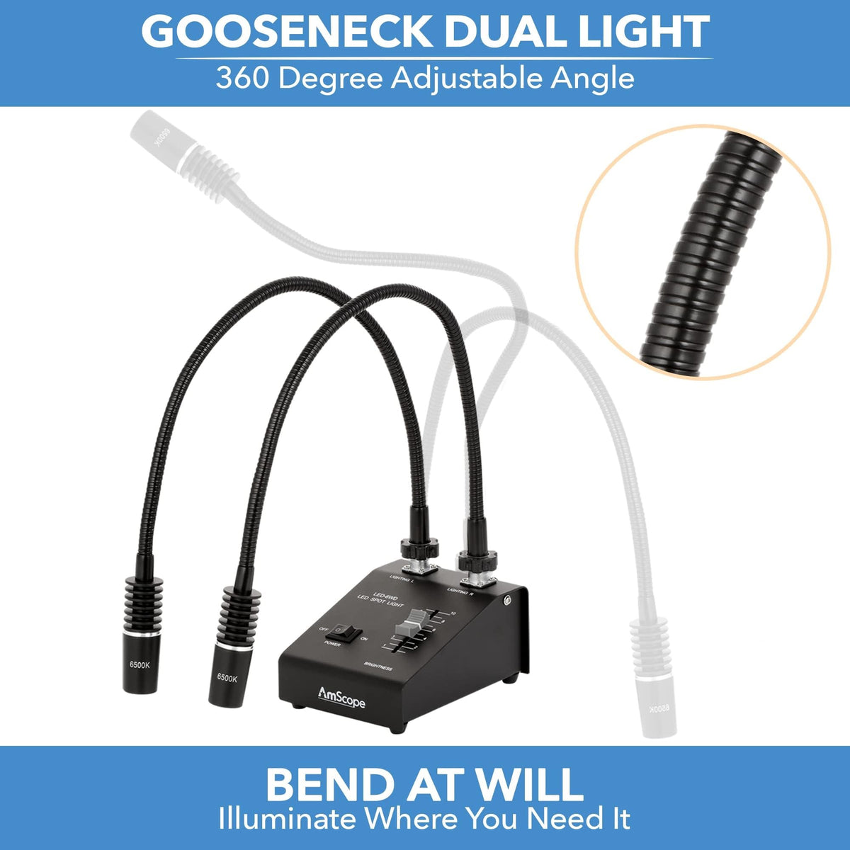 - **Versatile Design**: The dual gooseneck lights, each measuring 23-1/4" (590mm), can be bent into various positions to provide optimal lighting angles for your specimens.