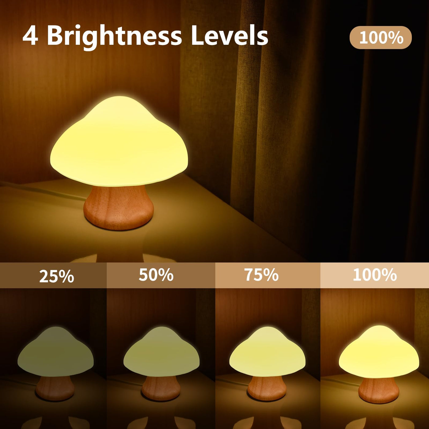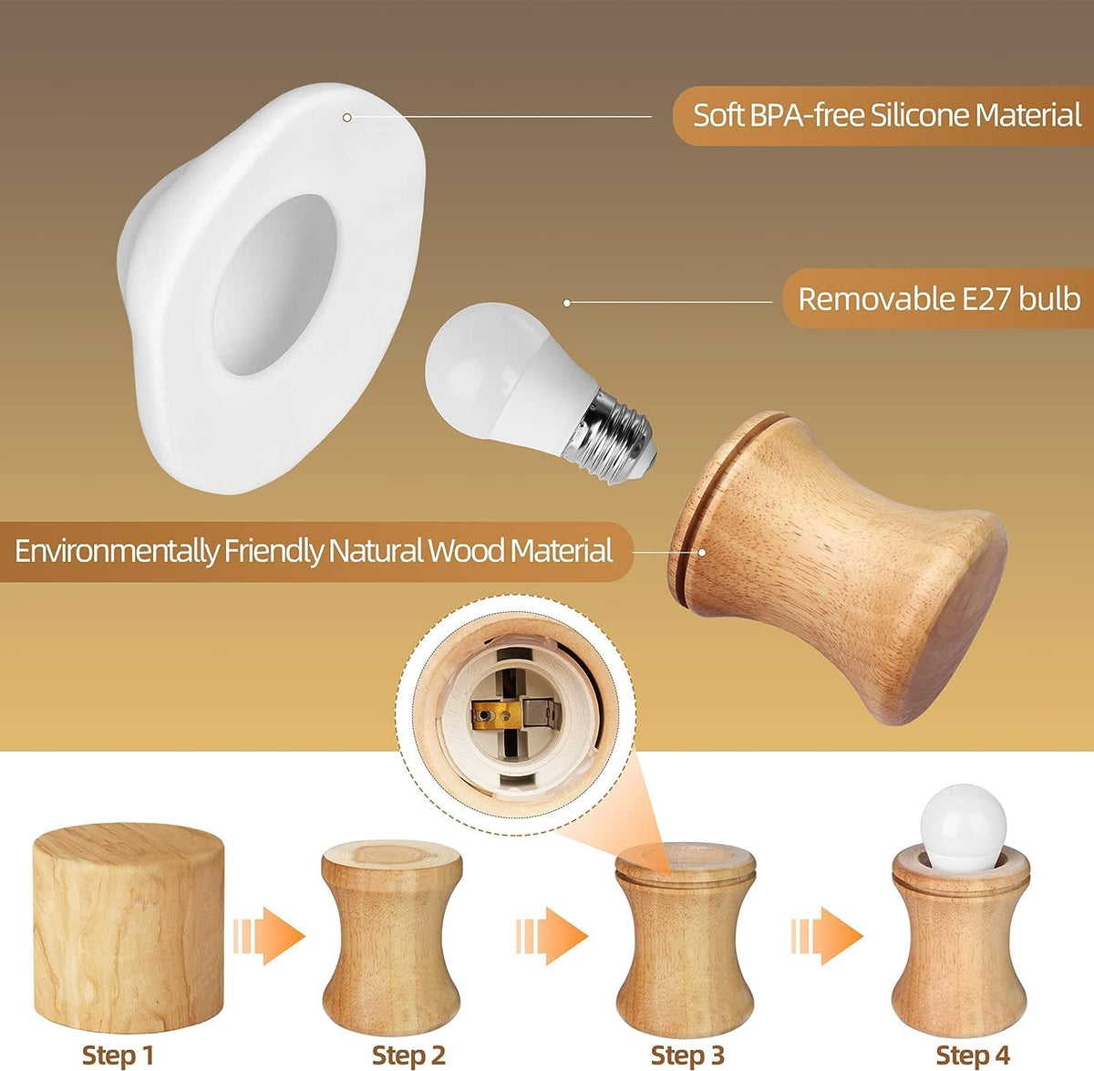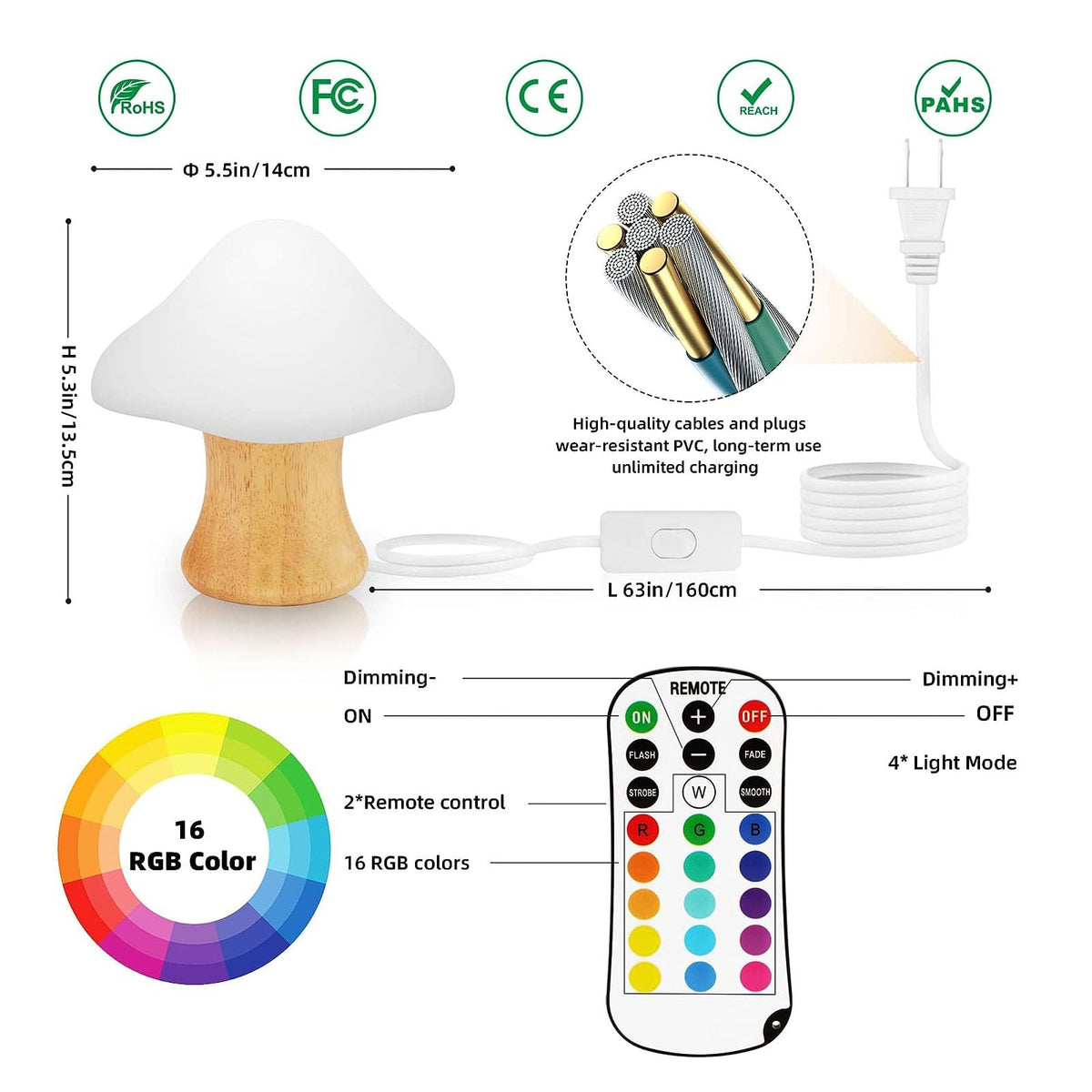 Feature:Eye-caring and warm light is really convenient for breastfeeding/nursing/changing nappies and so on at night. It can help young kids those are afraid the darkness to overcome the darkness, asleep well.NOT making any heat when you use the night light a whole night, safe for use. Remote control is easy to use for kids / parents.Ideal as a birthday gift, baby shower gift, new mother gift, gift for kids or baby girls and boys. Product Specifications:Item Name: Wooden mushroom night lightMaterial: soft silicone + rubber woodWeight: 12.35 ounces / 350 g Size: 5.5 5.5 5.5 inch / 14 14 14 cmPower: 3WInput voltage: DC5VCable Length: 63 inch /1.6m Remote Battery Mode: CR2025 Bulb Type: E27