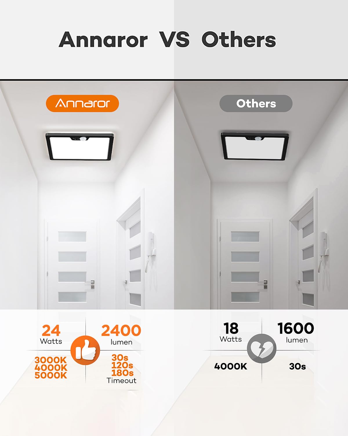 Q: Is the Annaror ceiling light energy-efficient?A: Yes, the Annaror ceiling light is designed to save energy by only turning on when motion is detected. It uses twenty-four watts of power while providing two thousand four hundred lumens of brightness, making it more efficient than traditional incandescent lights.