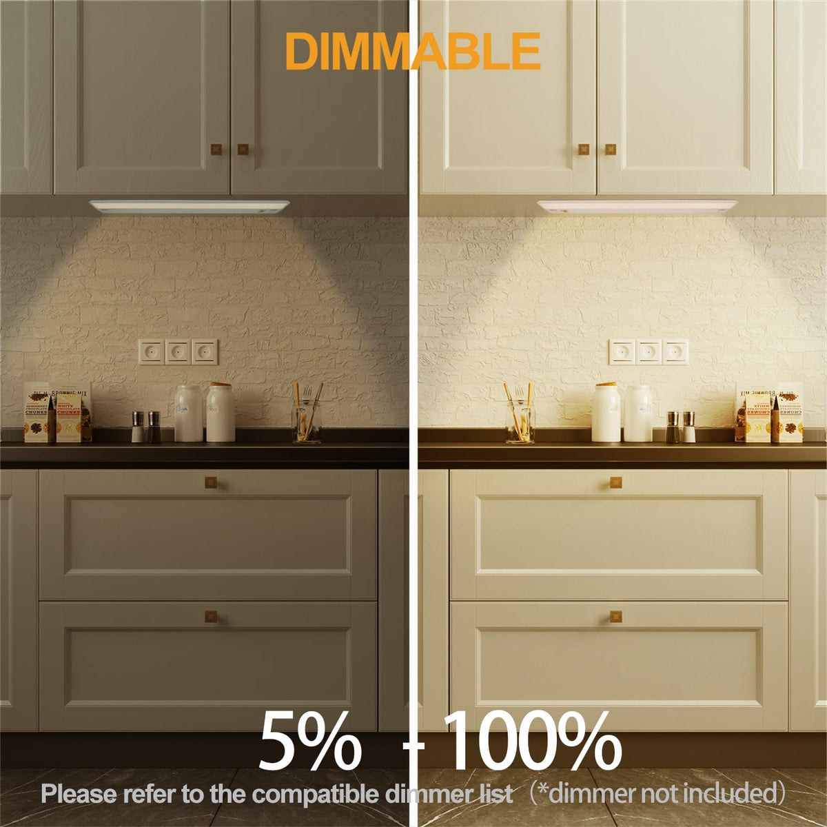 Q: Is the Ansen under cabinet light dimmable?A: Yes, the Ansen under cabinet light features smooth dimming capability from 100% to 5%, compatible with most LED dimmers, allowing you to adjust the brightness to your preference.