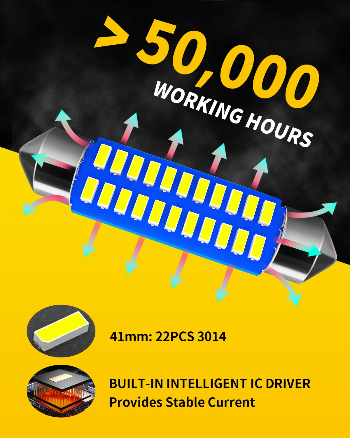 Upgrade your vehicle's lighting system with the Antline 41MM LED Bulbs, designed for superior brightness and efficiency. These LED bulbs are the perfect solution for those looking to enhance their car's interior and exterior lighting, providing a stunning 300% brighter output compared to traditional halogen bulbs. With 22 pieces of high-performance 3014 SMD LEDs emitting a brilliant 6000K~6500K white light, you can expect a pure, radiant illumination that transforms your driving experience.